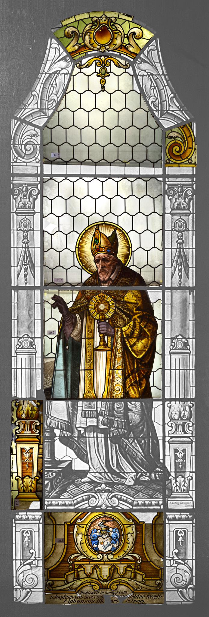 Fragmente einer Fensterverglasung mit der Darstellung des heiligen Alfons von Liguori auf einem architektonisch gestalteten Sockel. Der Heilige ist im Ornat des Bischofs mit Mitra gezeigt, die rechte Hand zum Segen erhoben, in der linken Hand eine Monstranz haltend. Ein breiter Rahmen mit geschmückten Säulen im Stil der Renaissance umfasste ursprünglich das ansonsten blank verglaste Fenster. Im Sockel Vollwappen des Stifters, an der Sockelbasis Stifterinschrift. Erhalten sind die beiden oberen Felder der Figur des Heiligen und der Sockel.