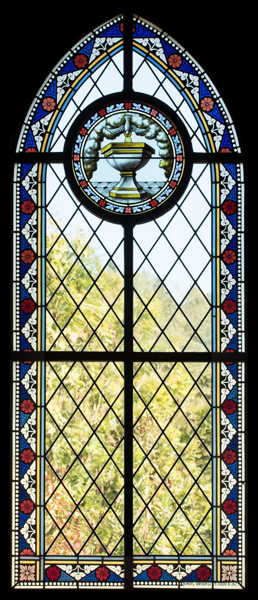 Spitzbogenfenster mit Rautenverglasung und einer Rahmung aus weissen Blattornamenten und roten Blüten. Im Bogenfeld ist ein Medaillon mit Darstellung eines Taufbeckens und der Taube des heiligen Geistes eingesetzt.