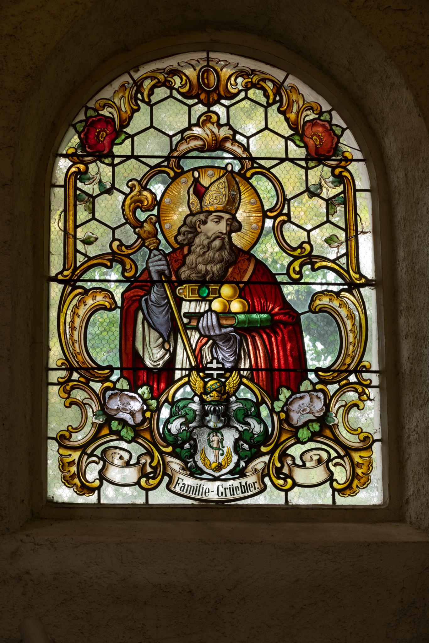 Rundbogenfenster mit blanker Wabenverglasung. Darstellung des heiligen Nikolaus mit seinen Attributen Buch und goldenen Kugeln. Kartusche mit Stifterwappen. Ornamentale Verzierungen mit Blumenranken und Rocaillen