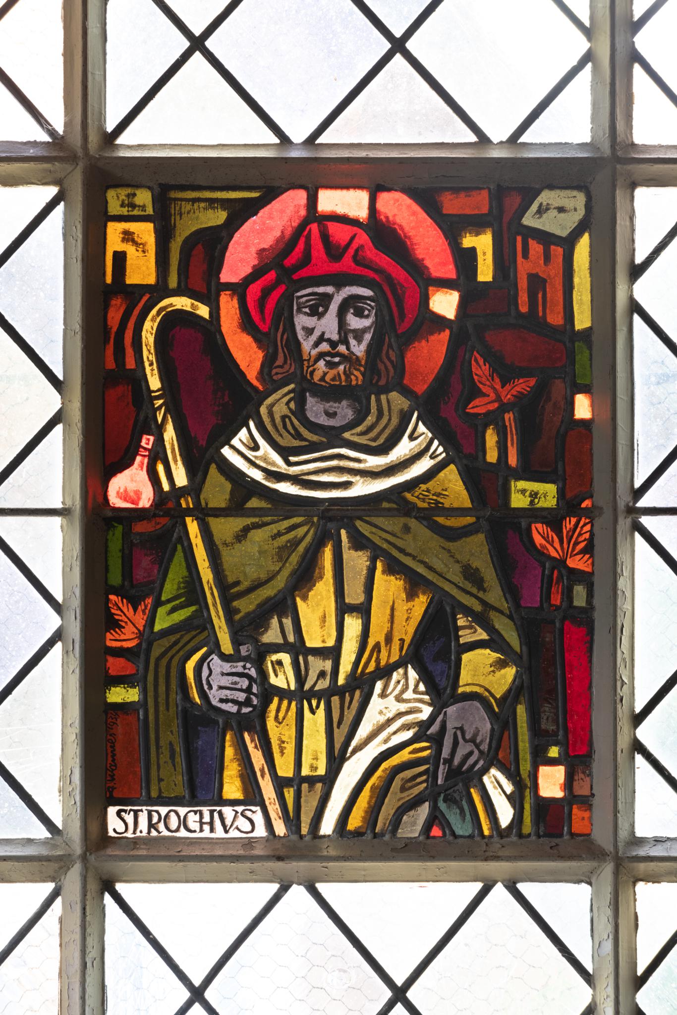 Rundbogenfenster mit blanker Rautenverglasung. Im zentralen Fensterfeld Darstellung des heiligen Rochus mit Pilgerstab und Trinkflasche.