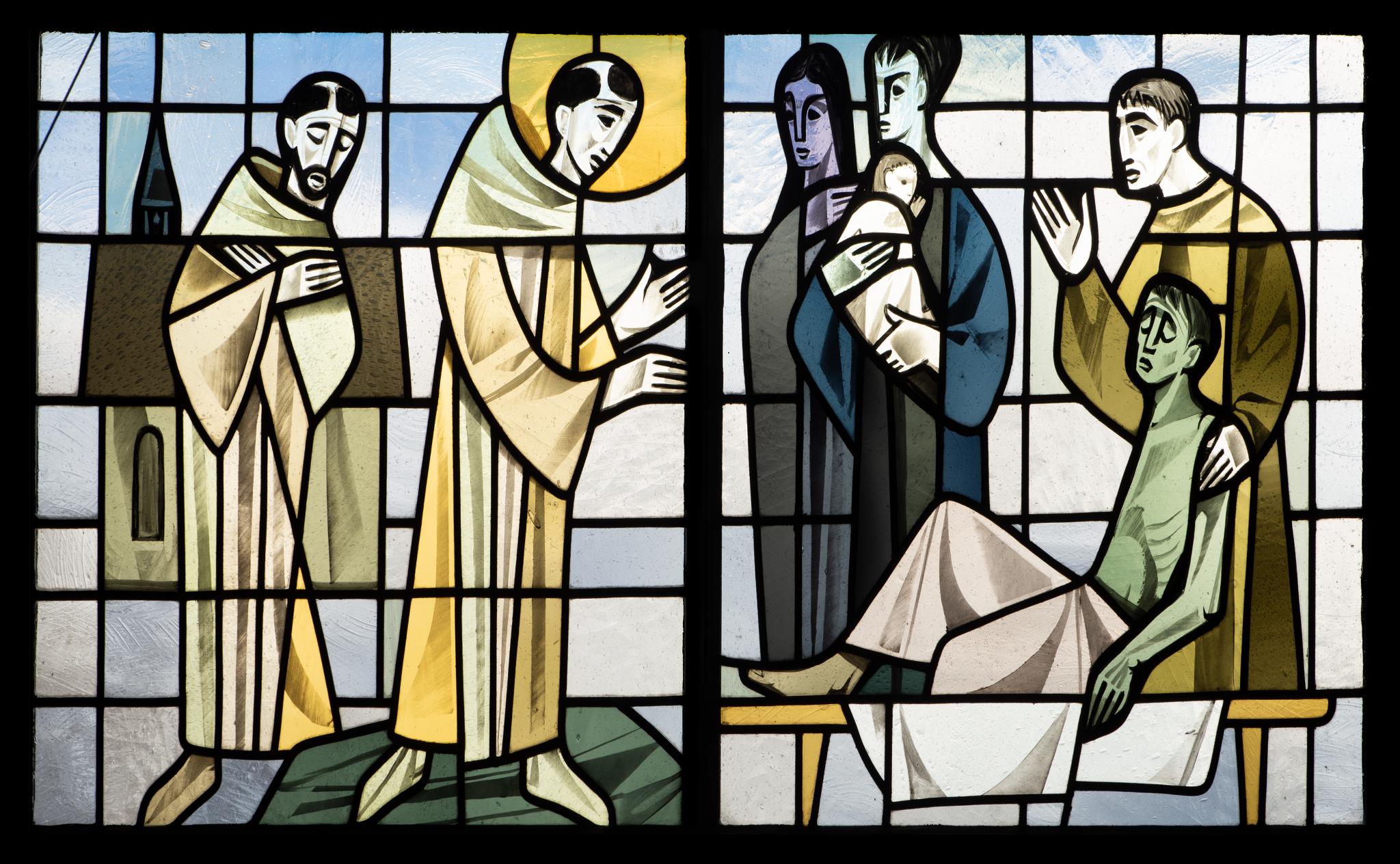 Links neigt sich der hl. Bernhard zu einem auf der Bahre liegenden Toten oder Kranken. Hinter Bernhard befindet sich ein Zisterziensermönch, hinter dem Mann auf der Bahre ein ihn stützender Mann, daneben eine Frau und ein Mann mit einem Kind auf dem Arm.