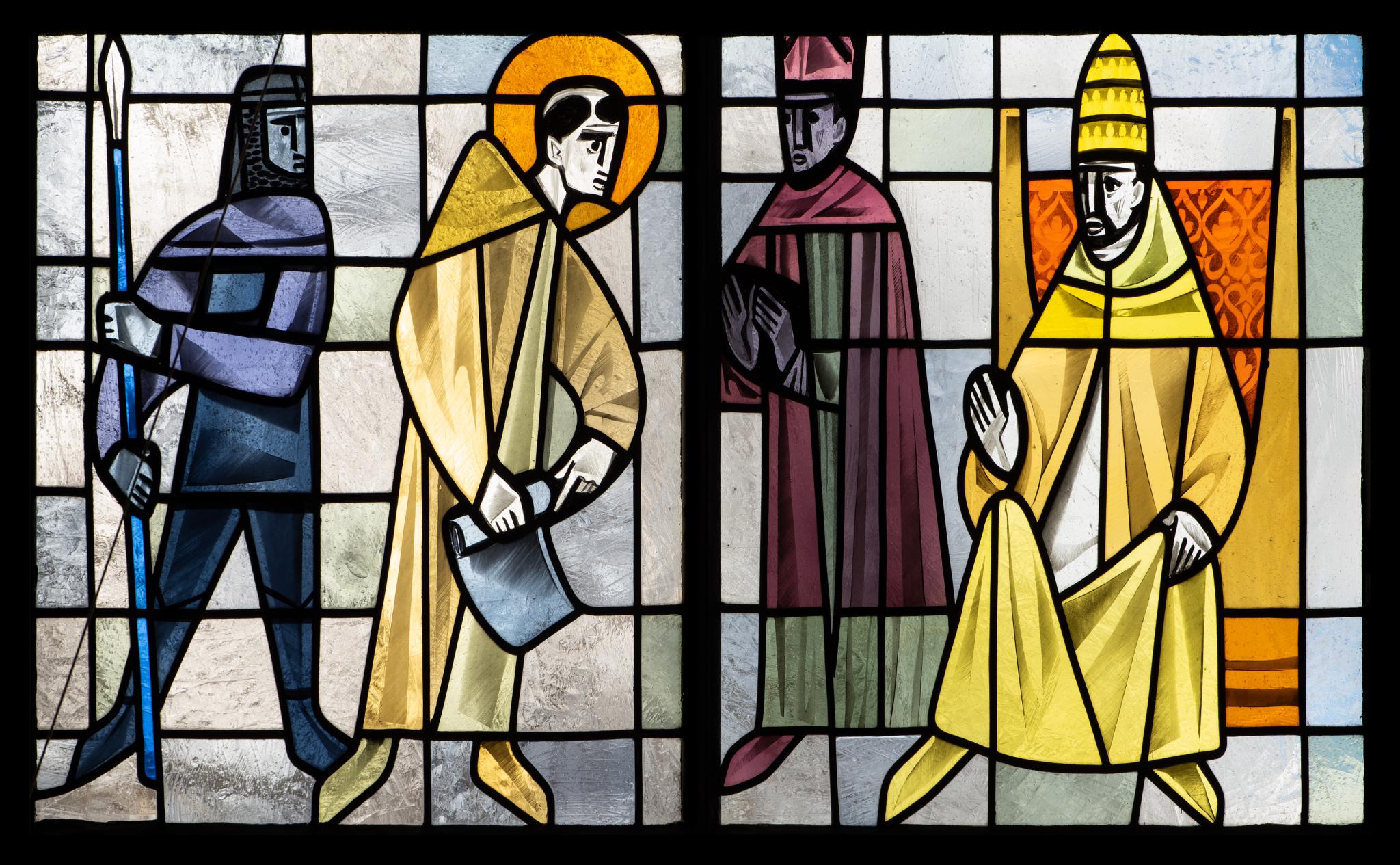 Der hl. Bernhard steht von einem Soldaten begleitet und mit einer Schriftrolle in der Hand vor dem thronenden Papst Innozenz II. Daneben steht ein Bischof.