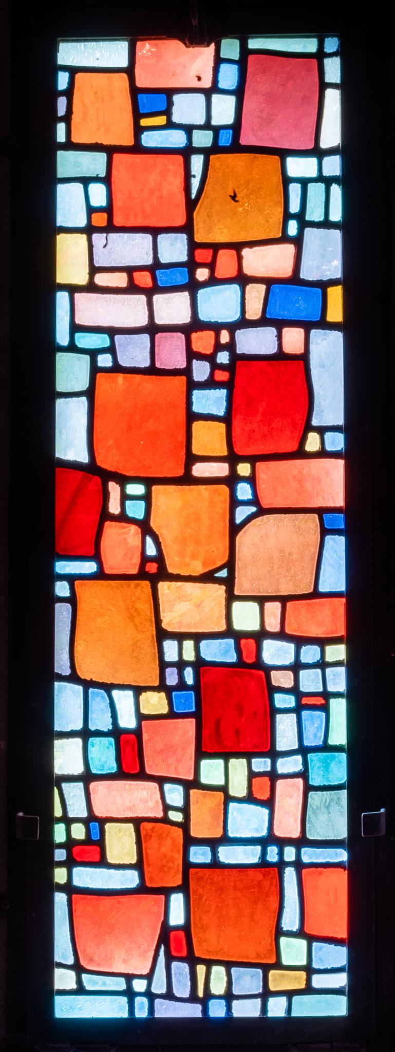 Abstraktes Glasgemälde aus grossen roten sowie kleinen weissen, blauen und gelben Glasstücken.