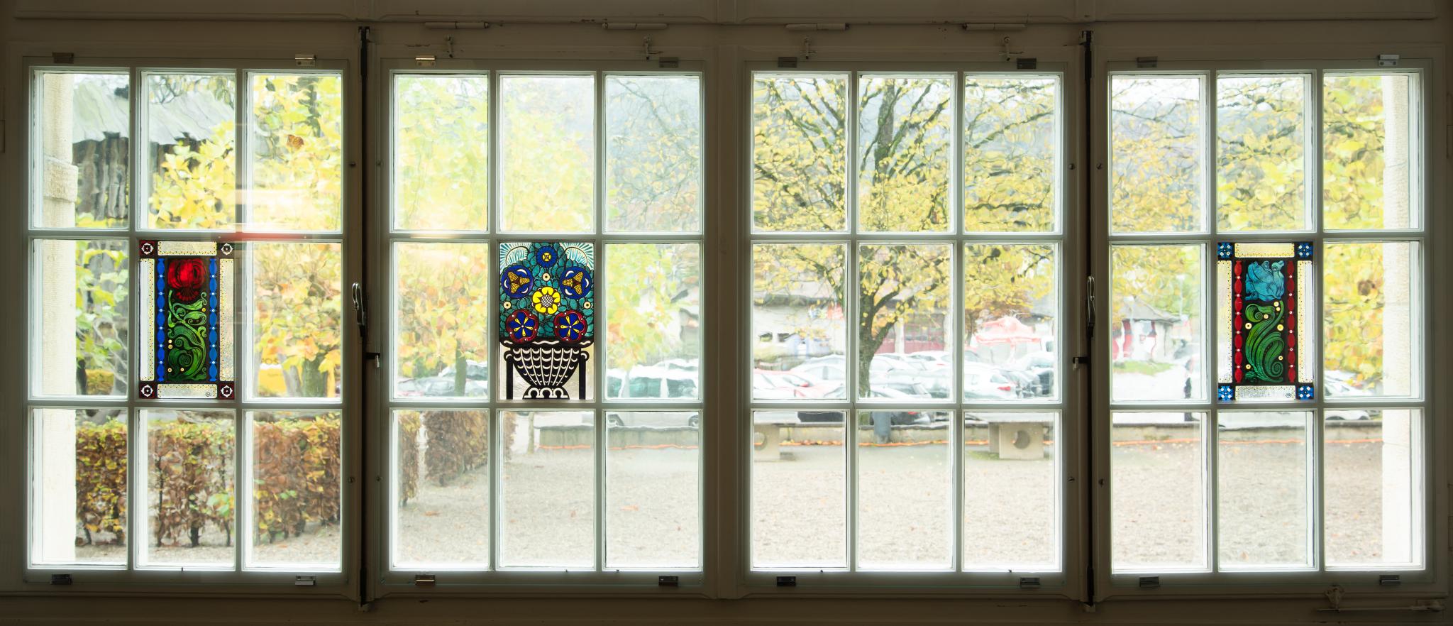 Achtteiliges Rundbogen-Sprossenfenster mit ursprünglich vier kleinformatigen Glasmalereien im Zentrum der unteren Fensterfelder. Links und rechts sind in der Formensprache des Jugendstils eine rote und eine blaue Blume in dekorativer Rahmung dargestellt. Eines der beiden mittleren Bilder fehlt, auf dem verbleibenden Bild ist eine stilisierte Schale mit farbigem Blumenbouquet gezeigt.