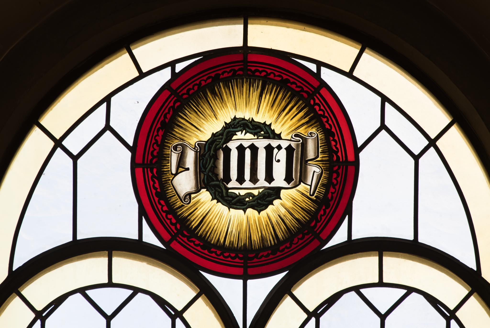 Rot gerahmtes Medaillon mit dem von einer Dornenkrone umfassten Schriftband “inri” vor einem Strahlenkranz im Bogenfeld eines Rundbogenfensters mit Blankverglasung (Schweizerrauten) und gelbem Rand.