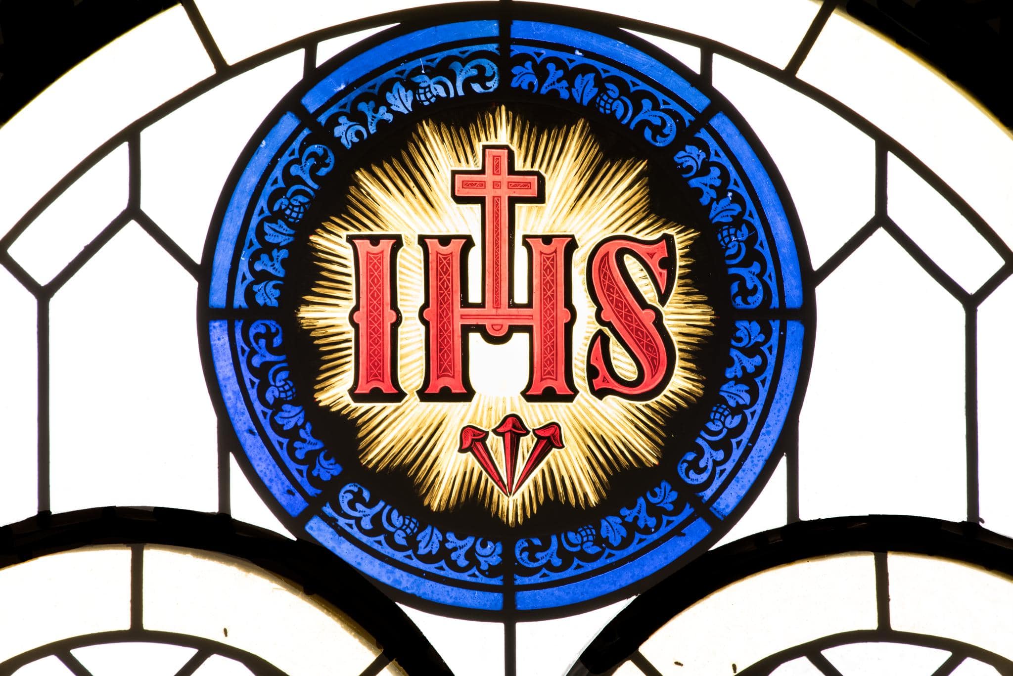 Blau gerahmtes Medaillon mit dem Monogramm Christi IHS, dem Kreuz und drei Nägeln vor einem Strahlenkranz im Bogenfeld eines Rundbogenfensters mit Blankverglasung (Schweizerrauten) und gelbem Rand.