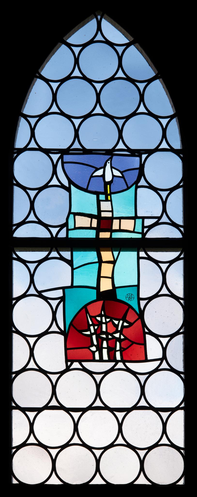 Spitzbogenfenster mit Butzenverglasung und zentraler figürlicher Darstellung. Auf einem roten, dornenbewachsenen Hügel steht ein Kreuz. Darüber schwebt vor blauem Himmel eine Taube.