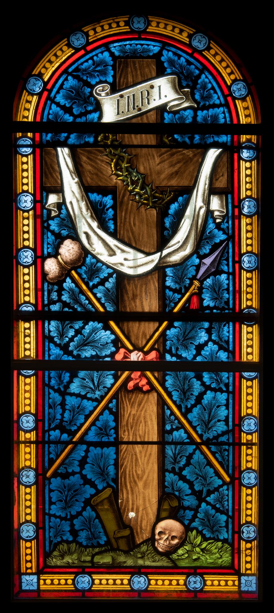 Dreiteiliges Rundbogenfenster mit einer Darstellung des Kreuzes und der Marterwerkzeuge. Um das Kreuz sind die Dornenkrone und ein weisses Tuch gewunden, Lanze und Stab mit Schwamm sind überkreuz daran festgebunden. Am obersten Teil des Kreuzes ist eine Schriftbanderole mit dem Kreuzestitel angebracht. Am Kreuzfuss Totenschädel.
