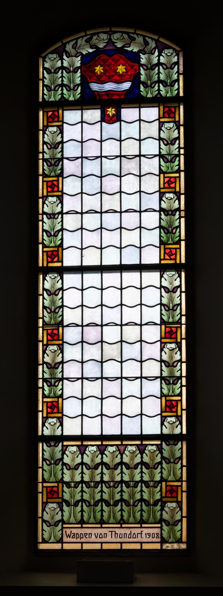 Vierteiliges Segmentbogenfenster mit vegetabilem Jugendstil-Ornament (stilisierte Blätter und Blüten) im Bogenfeld, am Scheibenfuss und als Einfassung des mittleren Fensterteils, dessen Fläche blank verglast wurde. Im Bogenfeld das Stifterwappen, am Scheibenfuss Stifterinschrift.