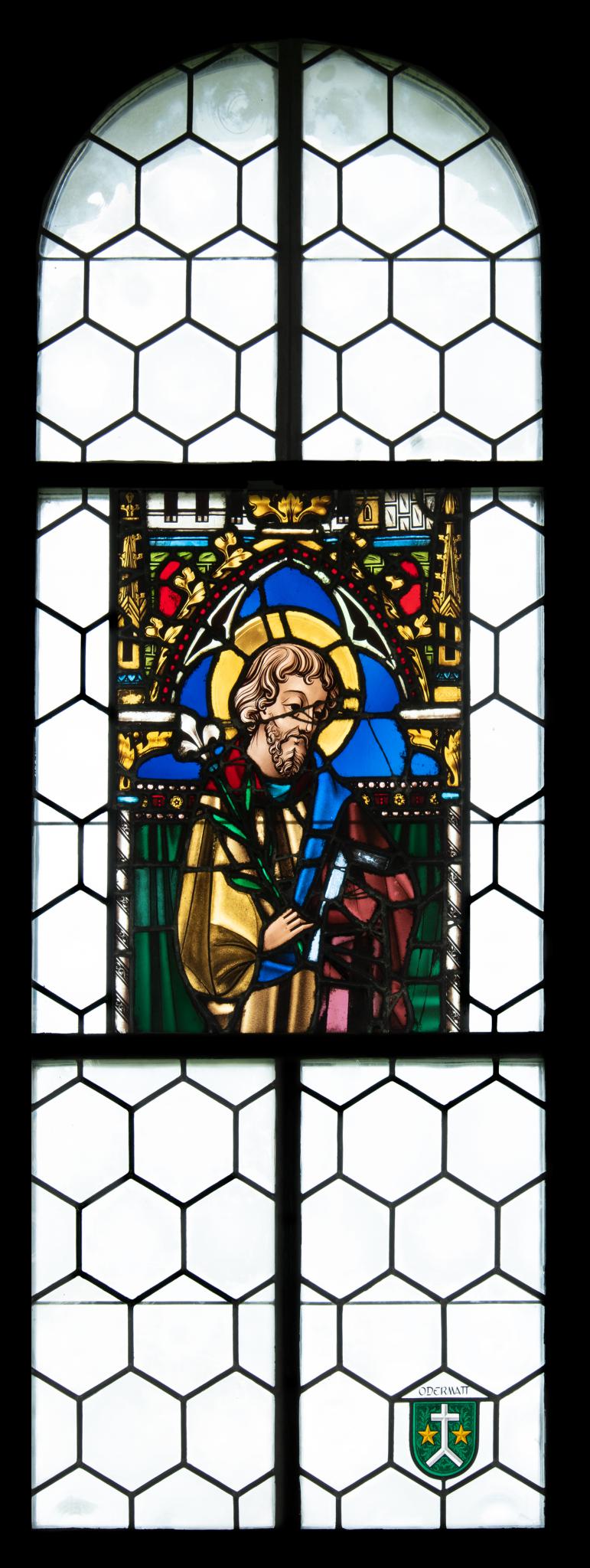 Rundbogenfenster mit Wabenverglasung. Im Mittelteil eingepasste gotisierende Glasmalerei mit Brustbild des heiligen Joseph vor einem Vorhang und unter einem mit Krabben besetzten Spitzbogen. Josef wird mit seinen Attributen, dem Zimmermannswinkel und der weissen Lilie, dargestellt. Unten rechts ein kleines Stifterwappen.