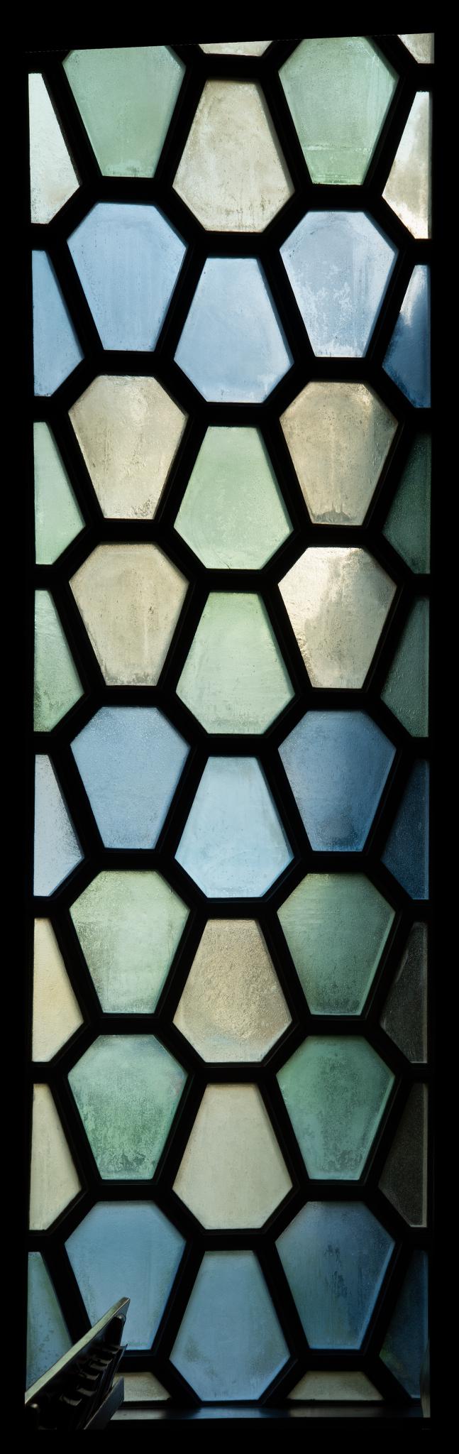 Die Fenster der Kapelle sind aus langgezogenen Sechsecken – analog zum Kapellengrundriss – aus Gläsern in Blau-, Grün- und Gelbtönen gebildet.