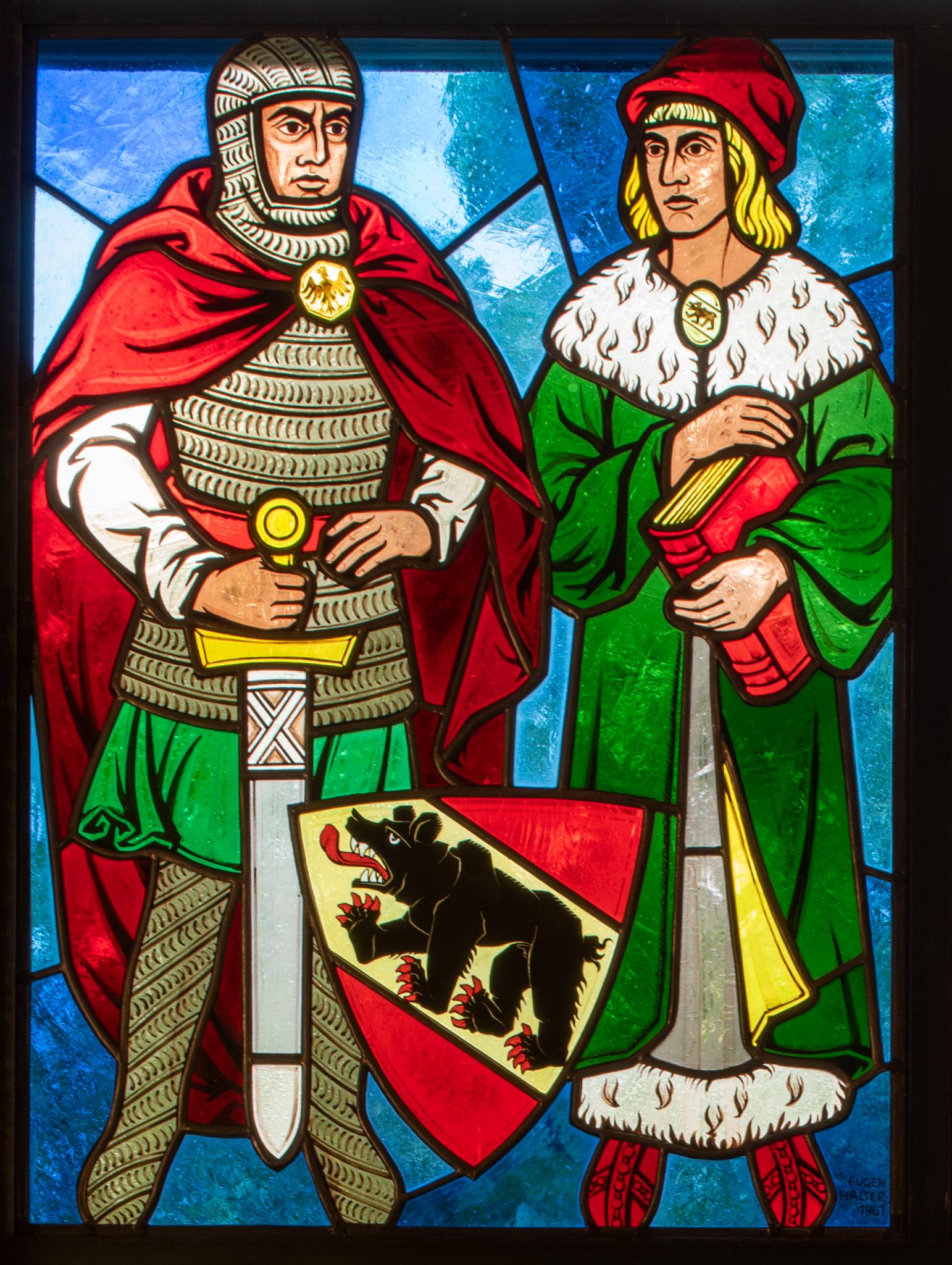 Der Zähringer Herzog Berchtold V. (†1218), Gründer der Stadt Bern auf der linken Seite und Konrad Justinger (†1438), Stadtschreiber und Chronist, zur rechten Seite stehen als Schildhalter hinter dem Wappen Berns.