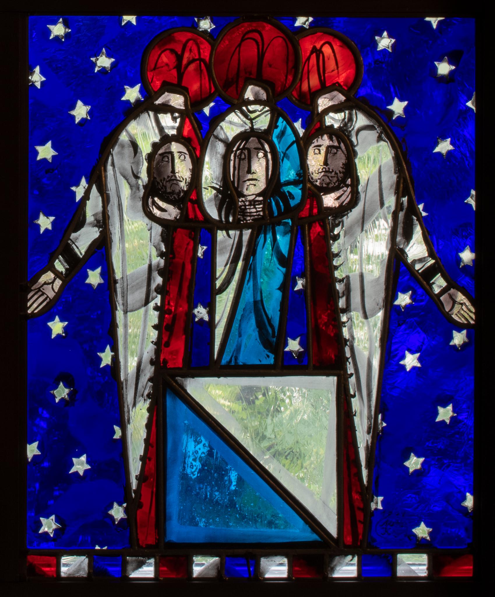 Die drei Stadtheiligen Zürichs, Regula, Felix und Exuperantius, werden vor dem Hintergrund eines Sternenhimmels dargestellt. Da sie den Märtyrertod durch Enthauptung erlitten, tragen sie ihre Köpfe in den Händen. Vor ihnen ist das Wappen Zürichs angebracht.
