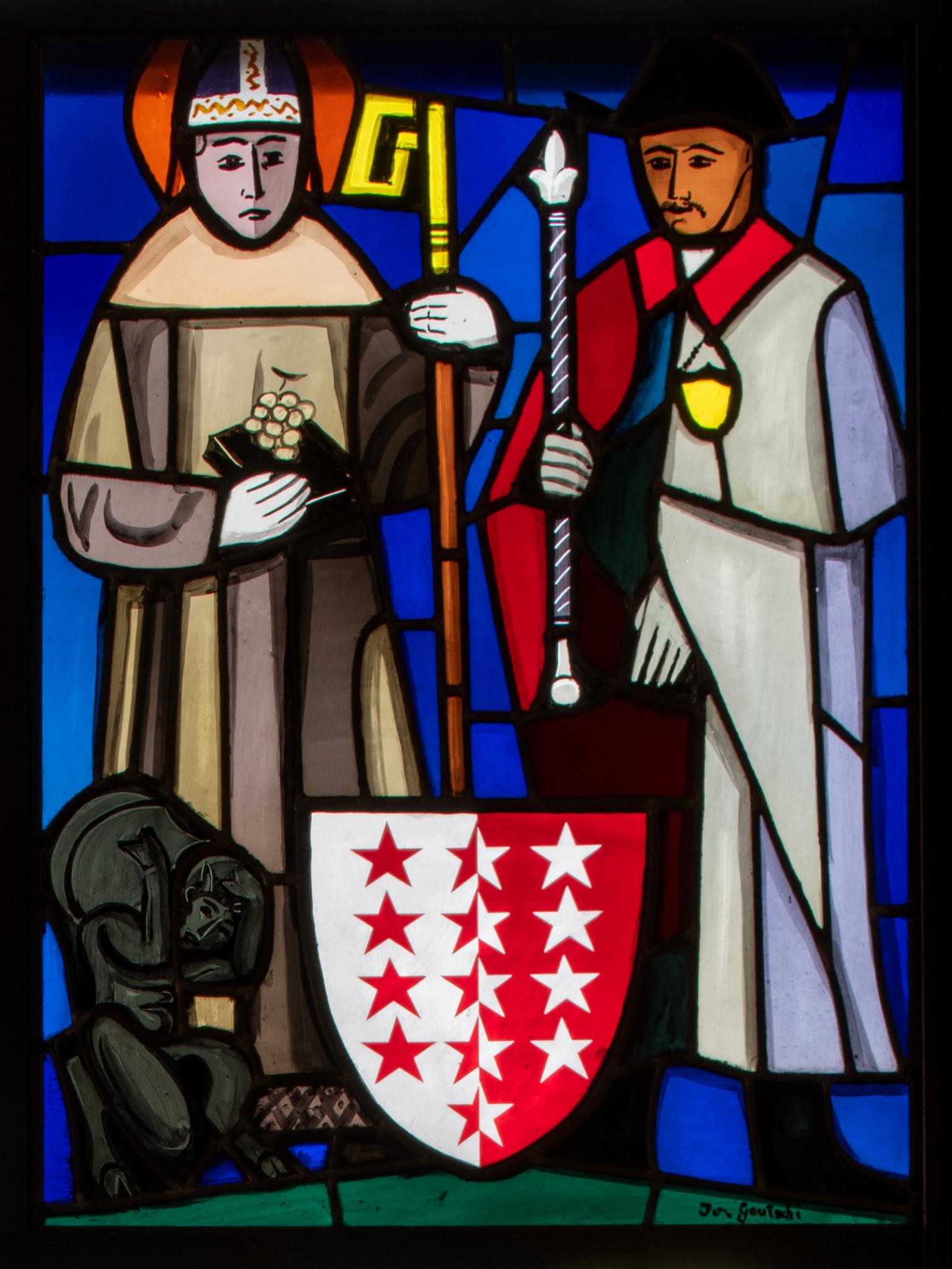Links steht der heilige Theodul mit dem glockentragenden Teufel als Schildhalter. Der Legende nach erhielt der Bischof die Glocke vom Papst und ein Teufel musste sie ihm von Rom nach Sitten tragen. Rechts fungiert ein Walliser Weibel als Schildhalter. Im Vordergrund erscheint der Wappenschild des Wallis.