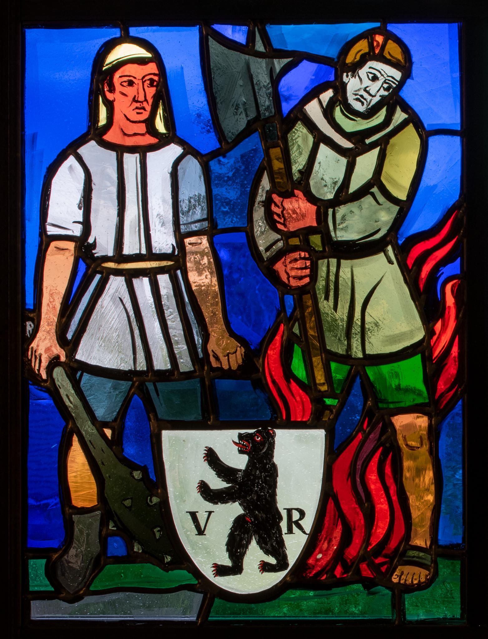 Links steht ein Appenzeller Kämpfer mit Morgenstern in der Hand. Rechts ist der Appenzeller Freiheitsheld Uli Rotach dargestellt. Nach der Legende erschlug dieser in der Schlacht von Stoos 1405 vor einer brennenden Scheune noch fast ein Dutzend Gegner, bevor er selbst in den Flammen umkam. Im Vordergrund ist der Wappenschild von Appenzell Ausserrhoden angebracht.
