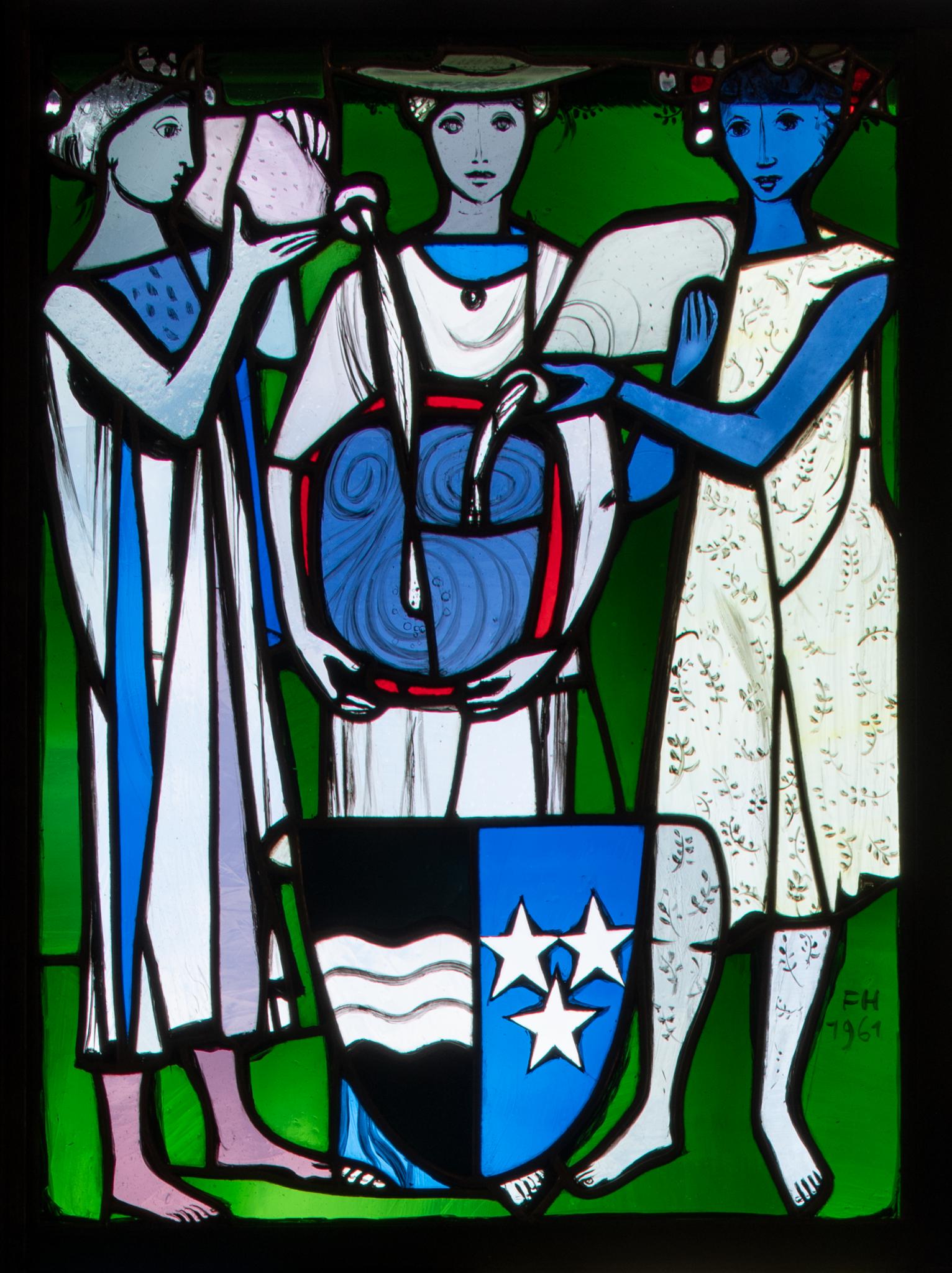 Drei Frauenfiguren mit Wasserkrügen und einem Wasserbecken versinnbildlichen die drei Flüsse Aare, Reuss und Limmat, die im Wasserschloss der Schweiz im Kanton Aargau zusammenfliessen. Vor ihnen ist der Wappenschild des Aargau, dessen Wellen ebenfalls auf die drei Flüsse verweisen, angebracht.