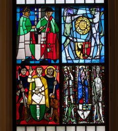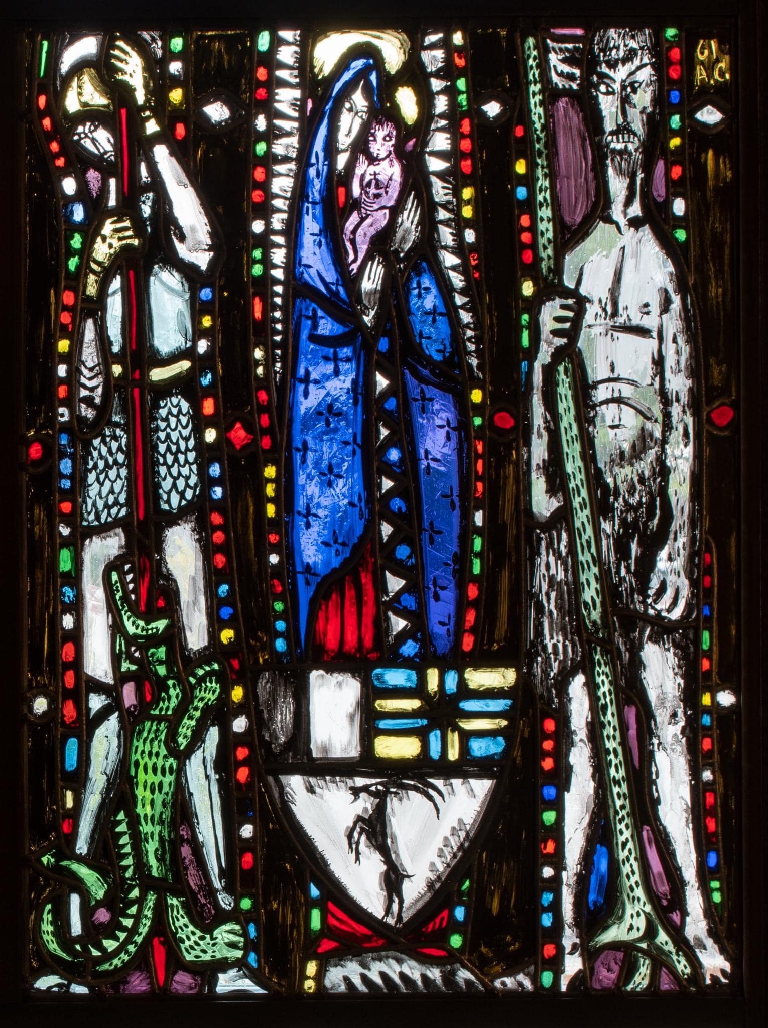 11H(GEORGE) · Georges, guerrier martyr; attributs possibles : bannière (croix rouge en champ blanc), croix (rouge), dragon, cheval (blanc), lance brisée, bouclier (marquée d'une croix), épée