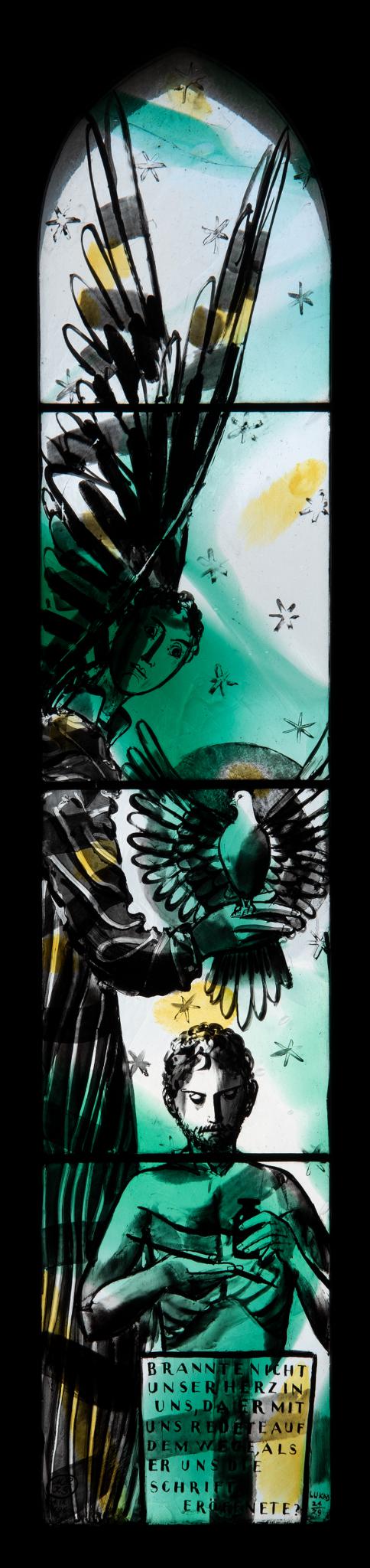Im Vordergrund steht ein Mann (der Evangelist Lukas?) mit Feder und Tintenfass an einem Schreibpult. Hinter ihm erhebt sich ein Engel, auf dessen Hand die Taube des Heiligen Geistes sitzt. Die Inschrift auf dem Schreibpult verweist auf Lukas 24, 32, den Moment als die Emmaus-Jünger den auferstandenen Christus erkennen.
