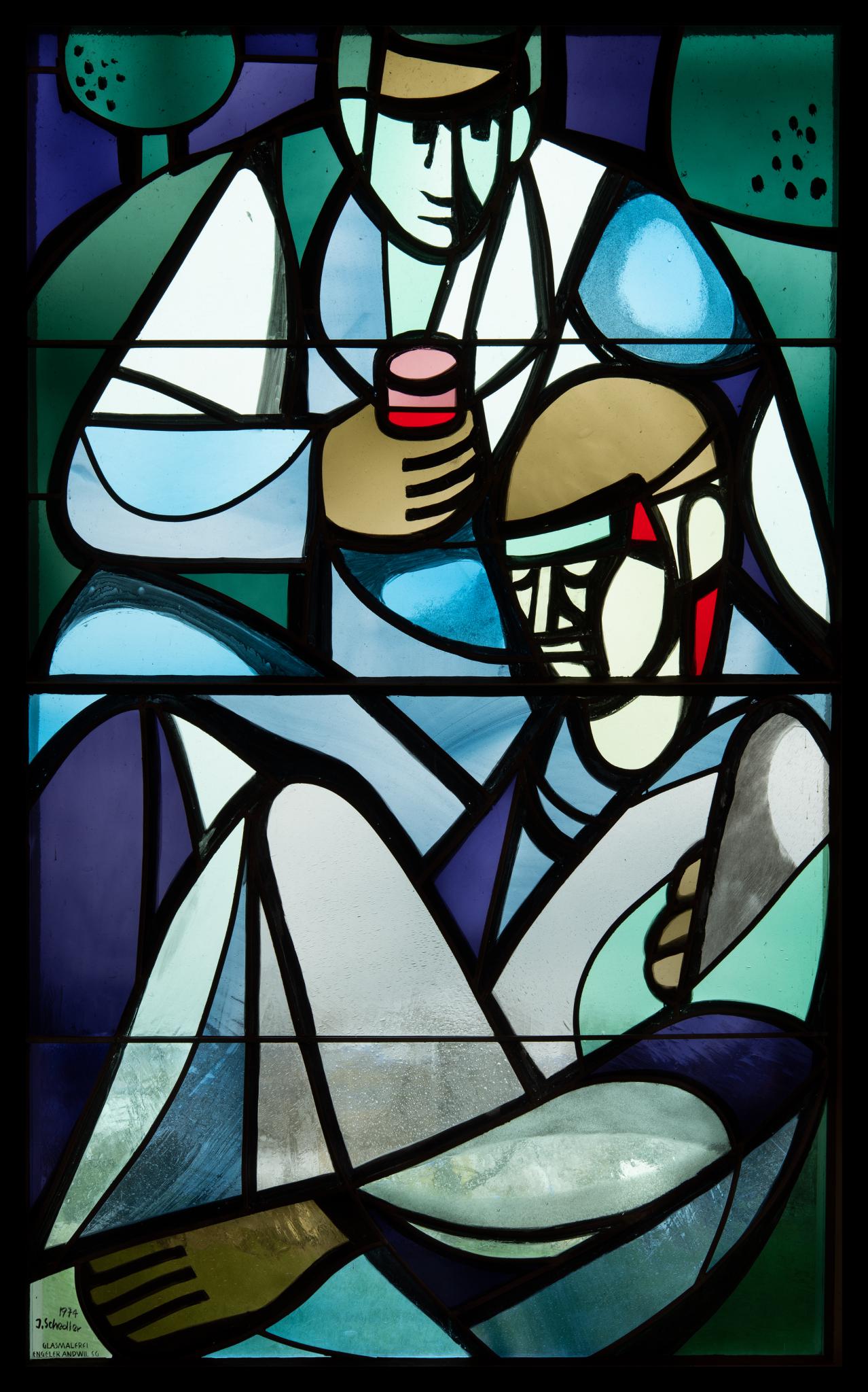 Im Vordergrund liegt der verletzte Mann, hinter ihm beugt sich der Samariter zu ihm hin und reicht ihm zu trinken.