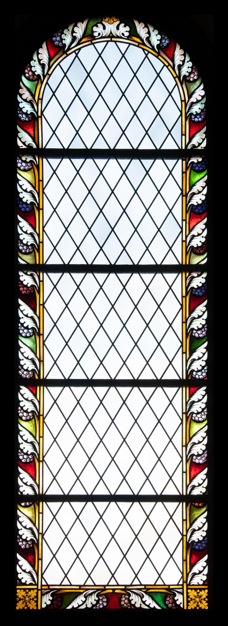 Fünfteiliges Rundbogenfenster mit Rautenverglasung und Zierrahmen mit stilisiertem Pflanzenfries. Die jeweils gegenüberliegenden Fenster im Schiff entsprechen einander.