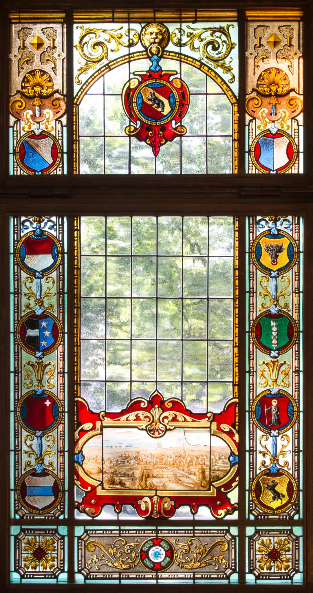 1888 erhielt der grosse Bürgersaal drei grosse Glasfenster von Friedrich Berbig. Die Gestaltung des mittleren Fensters (TG_2105) gab Anlass zu Diskussionen. Berbig sah eine Wappenpyramide mit dem Stadt- und Kantonswappen, überhöht mit einem eidgenössischen Kreuz, vor. Der Verwaltungsrat wollte an Stelle des eidgenössischen Wappens einen Helm mit Federbusch setzen. Dies veranlasste Berbig, Johann Rudolf Rahn, Professor für Kunstgeschichte am Polytechnikum, beizuziehen. Dieser empfahl, hinter dem Wappen den Knaben Tell mit dem vom Pfeil durchbohrten Apfel anzubringen. Obschon Rahns Empfehlung mit grösstem Dank für gut befunden wurde, verwarf der Verwaltungsrat den Vorschlag. Im schliesslich ausgeführten Mittelfenster halten ein eidgenössischer Bannerträger und ein Ratsherrn in mittelalterlicher Tracht Stadt- und Kantonswappen. Der Bannerträger hält eine Fahne mit dem Schweizerkreuz, der Platz über den beiden Wappen ist hingegen leer gelassen (Ausführlich hierzu: Gysel, 2020, S. 260f.)