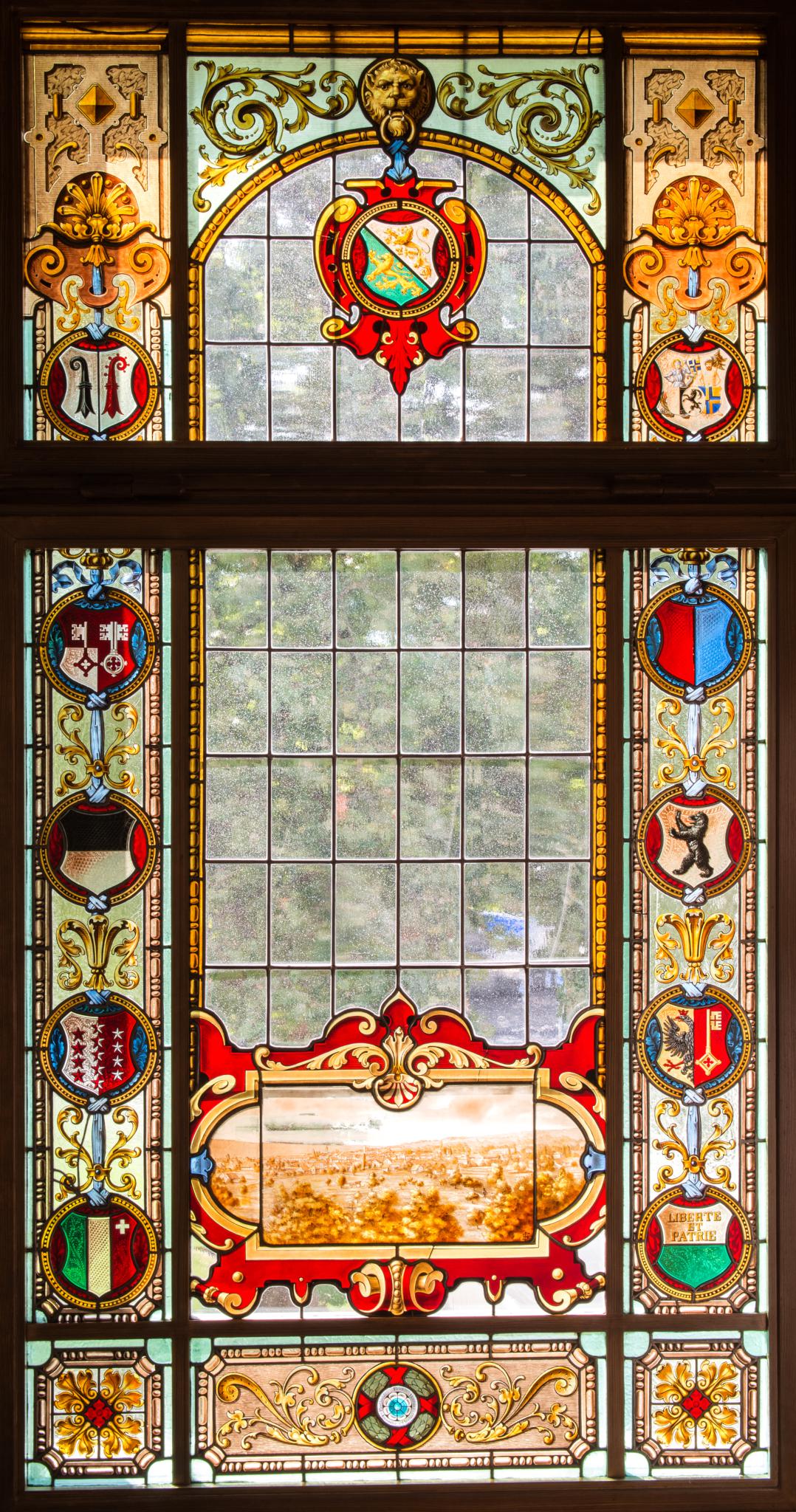 1888 erhielt der grosse Bürgersaal drei grosse Glasfenster von Friedrich Berbig. Die Gestaltung des mittleren Fensters (TG_2105) gab Anlass zu Diskussionen. Berbig sah eine Wappenpyramide mit dem Stadt- und Kantonswappen, überhöht mit einem eidgenössischen Kreuz, vor. Der Verwaltungsrat wollte an Stelle des eidgenössischen Wappens einen Helm mit Federbusch setzen. Dies veranlasste Berbig, Johann Rudolf Rahn, Professor für Kunstgeschichte am Polytechnikum, beizuziehen. Dieser empfahl, hinter dem Wappen den Knaben Tell mit dem vom Pfeil durchbohrten Apfel anzubringen. Obschon Rahns Empfehlung mit grösstem Dank für gut befunden wurde, verwarf der Verwaltungsrat den Vorschlag. Im schliesslich ausgeführten Mittelfenster halten ein eidgenössischer Bannerträger und ein Ratsherrn in mittelalterlicher Tracht Stadt- und Kantonswappen. Der Bannerträger hält eine Fahne mit dem Schweizerkreuz, der Platz über den beiden Wappen ist hingegen leer gelassen (Ausführlich hierzu: Gysel, 2020, S. 260f.)