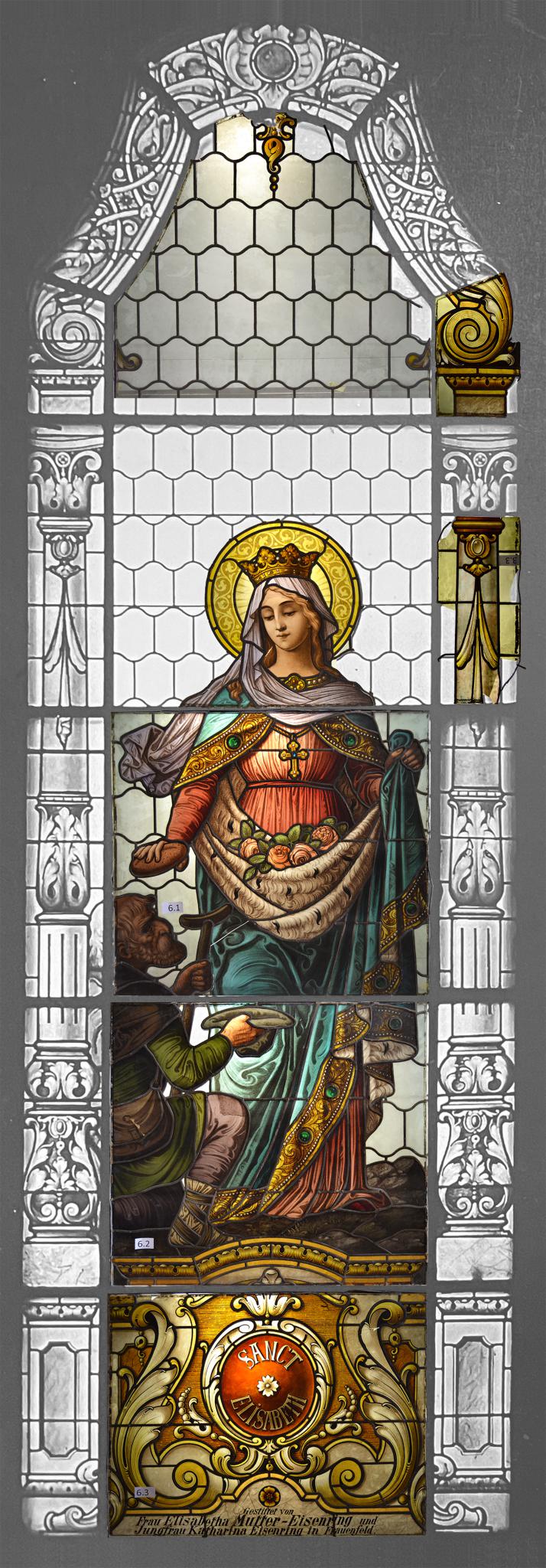 Fragmente einer Fensterverglasung mit der Darstellung der heiligen Elisabeth von Thüringen auf einem architektonisch gestalteten Sockel. Die Heilige ist in einem reichen Gewand und mit Krone gezeigt, wie sie einem vor ihr knienden alten Bettler ein Brot überreicht. Im gerafften Mantel trägt sie Rosenblüten. Ein breiter Rahmen mit geschmückten Säulen im Stil der Renaissance umfasste ursprünglich das ansonsten blank verglaste Fenster. Im Sockel Medaillon mit Namenszug, an der Sockelbasis Stifterinschrift. Erhalten sind die Felder mit der Figur der Heiligen und der Sockel.