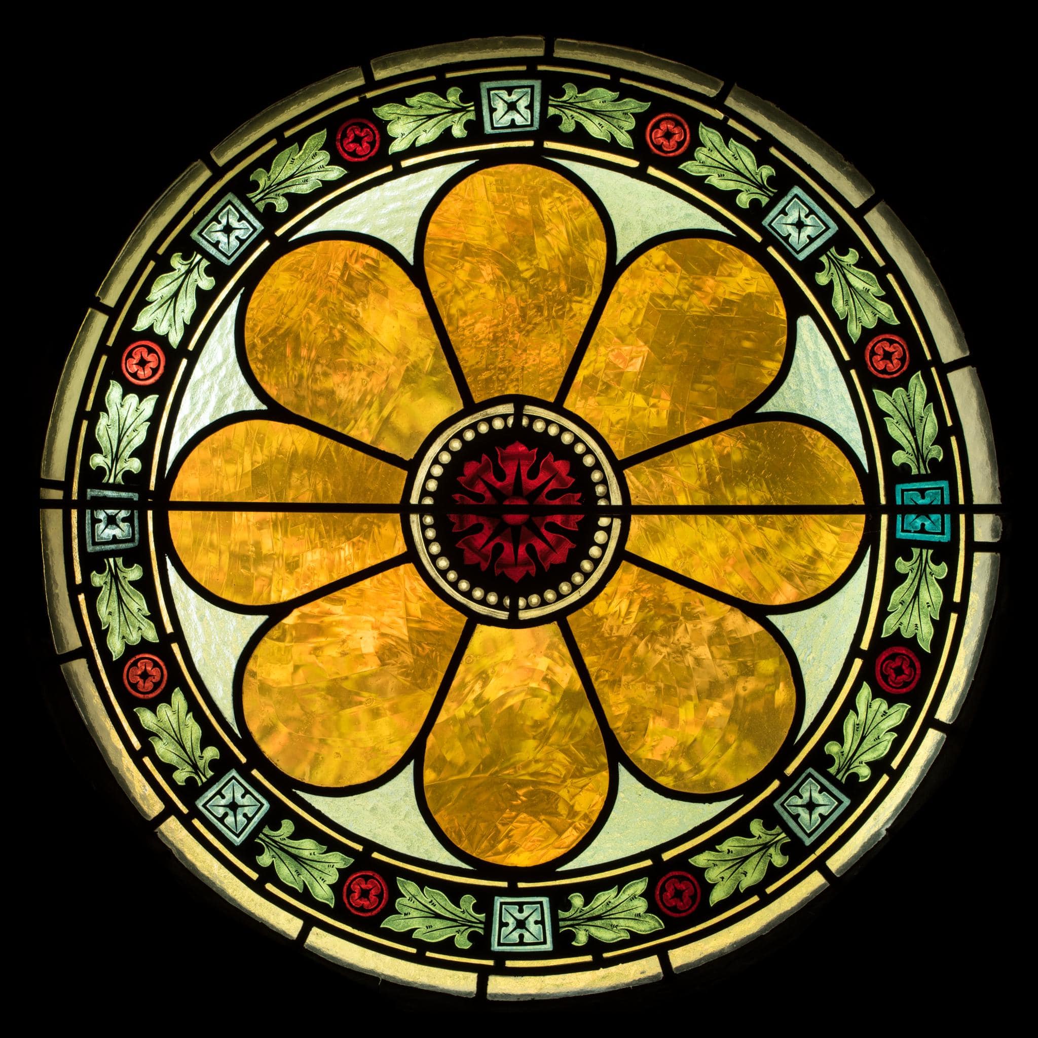 Rundfenster mit achtblättriger Rosette und floraler Randverzierung. Grundfarben Gelb, Blau, Rot, Grün.