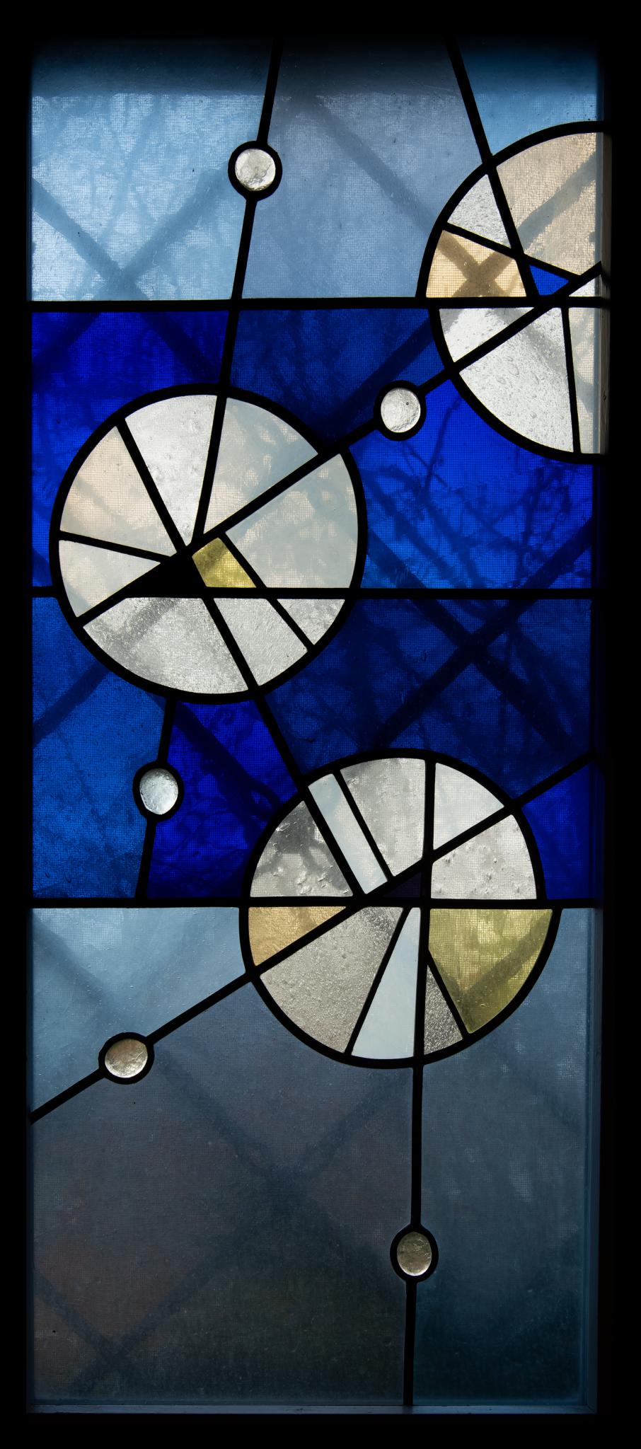 Drei helle, unterteilte Kreise vor blauem Hintergrund, verbunden durch Bleistege.