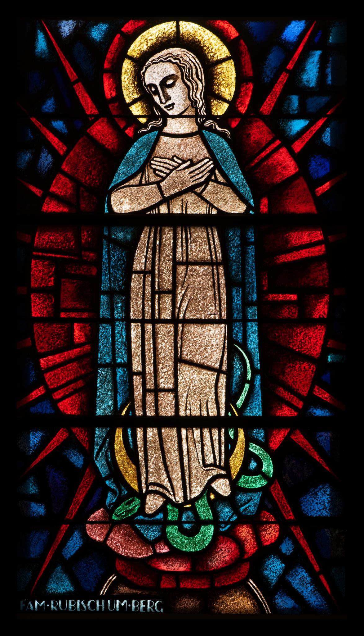 Hochrechteckiges schmales Fenster mit farbigen Rechtecken und Rahmenverzierung. Im unteren Drittel eine Darstellung der Maria im Strahlenkranz und auf Halbmond und Schlange stehend als Symbol der unbefleckten Empfängnis.