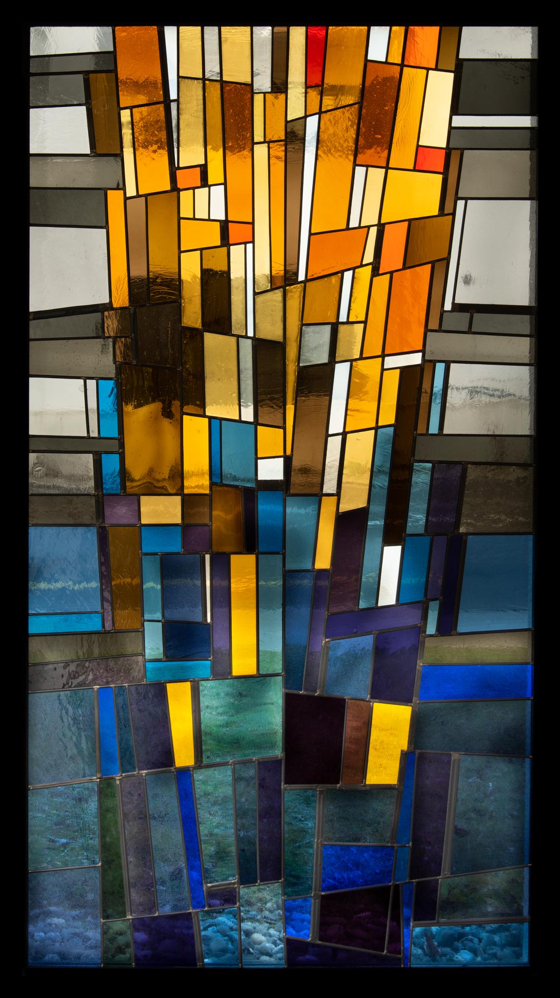 Vertikale Rechtecke bilden eine in die Höhe strebende Form, farblich von Blau- zu Orangetönen übergehend. Beide Glasgemälde zeigen dieselbe Darstellung in gespiegelter Form.