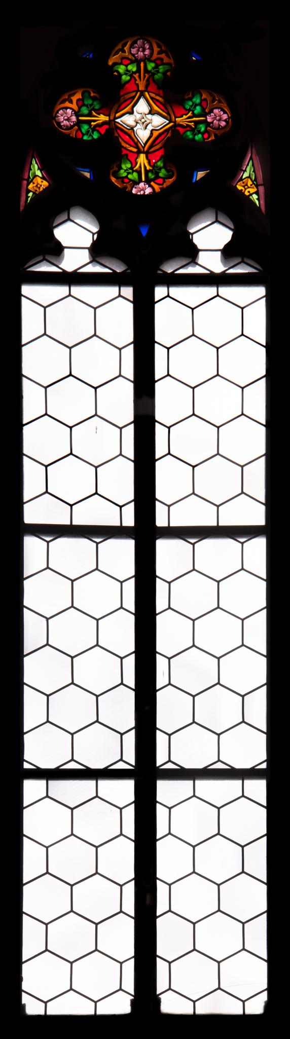 Zweilanzettiges Masswerkfenster mit blanker Wabenverglasung, das Masswerk – Vierpass und Eckspickel – mit farbigen Blatt- und Blütenornamenten geschmückt.