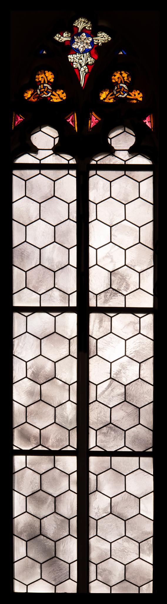 Zweilanzettiges Masswerkfenster mit blanker Wabenverglasung, das Masswerk – Fischblasen und Eckspickel – mit farbigen Krabben- und Blattornamenten geschmückt.