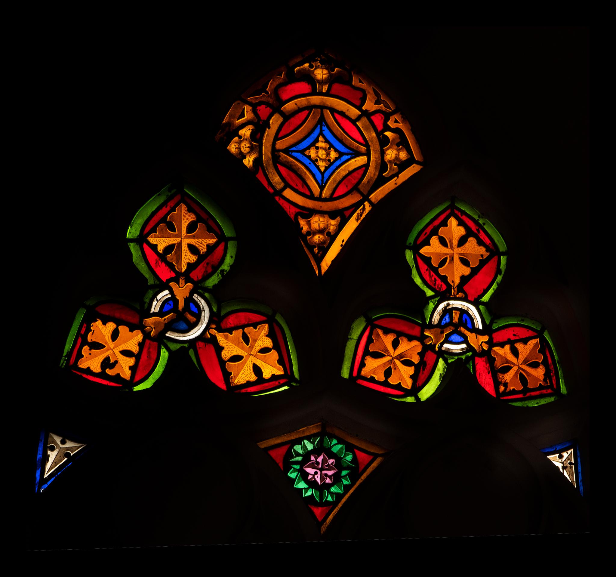 Zweilanzettiges Masswerkfenster, dessen Masswerk – Dreipässe und Eckspickel – mit farbigen Krabben- und Blattornamenten geschmückt ist. Die Lanzetten sind mit Platten verschlossen, da sie teilweise vom Dach der Allerheiligenkapelle verdeckt werden.