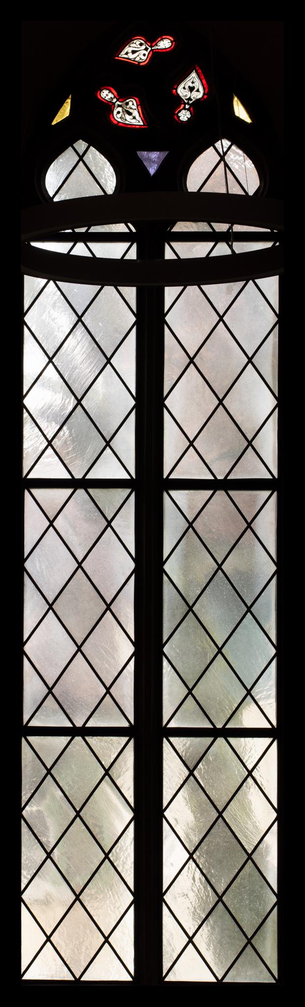 Zweilanzettiges Masswerkfenster mit blanker Rautenverglasung, im farbig gestalteten Couronnement (Fischblasen) stilisierte Krabben. Identisch mit gegenüberliegendem Fenster s IX.