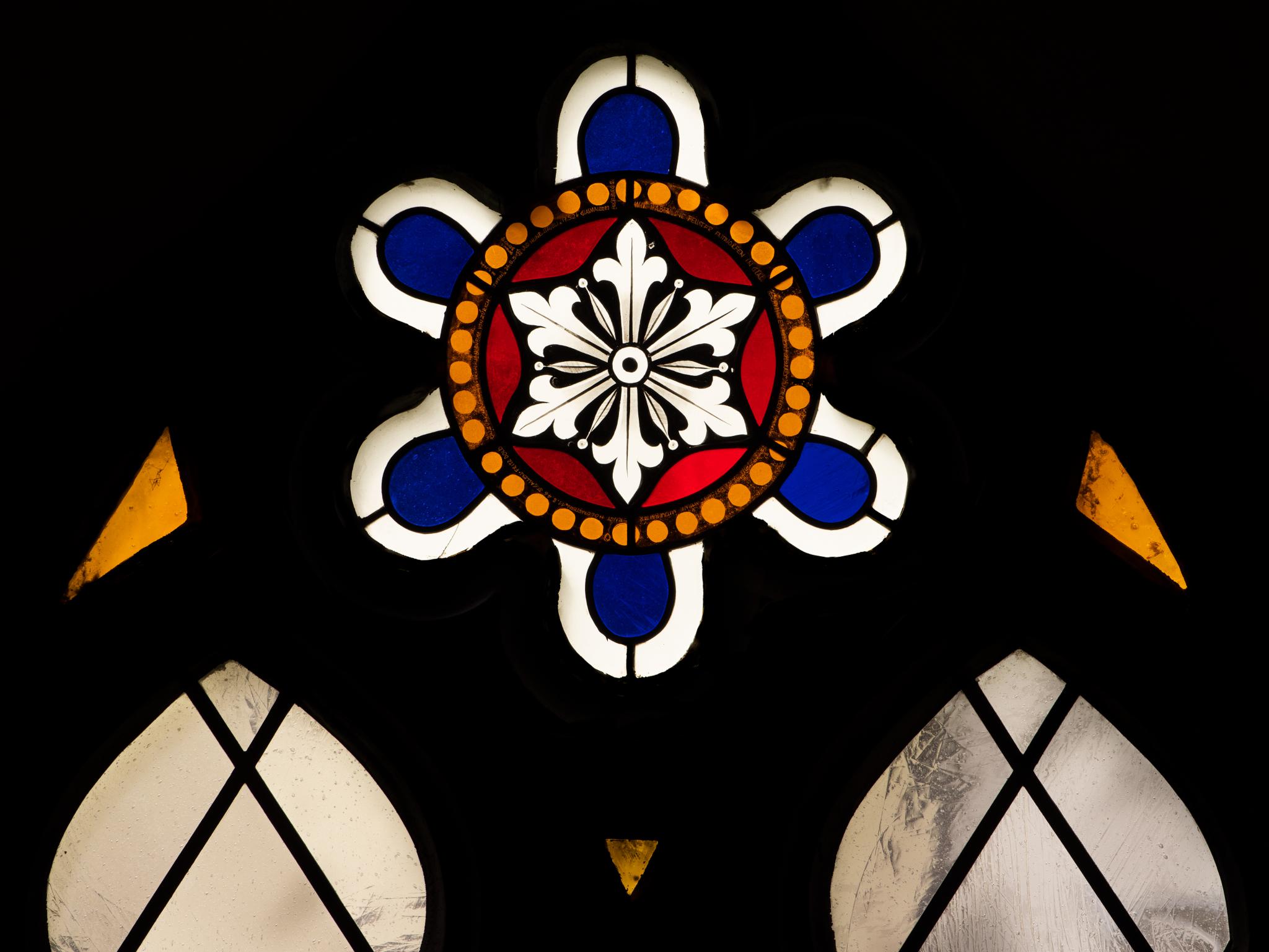 Zweilanzettiges Masswerkfenster mit blanker Rautenverglasung und mit stilisierter Blüte im farbig gestalteten Couronnement (Sechspass). Identisch mit gegenüberliegendem Fenster n X (TG_2358).