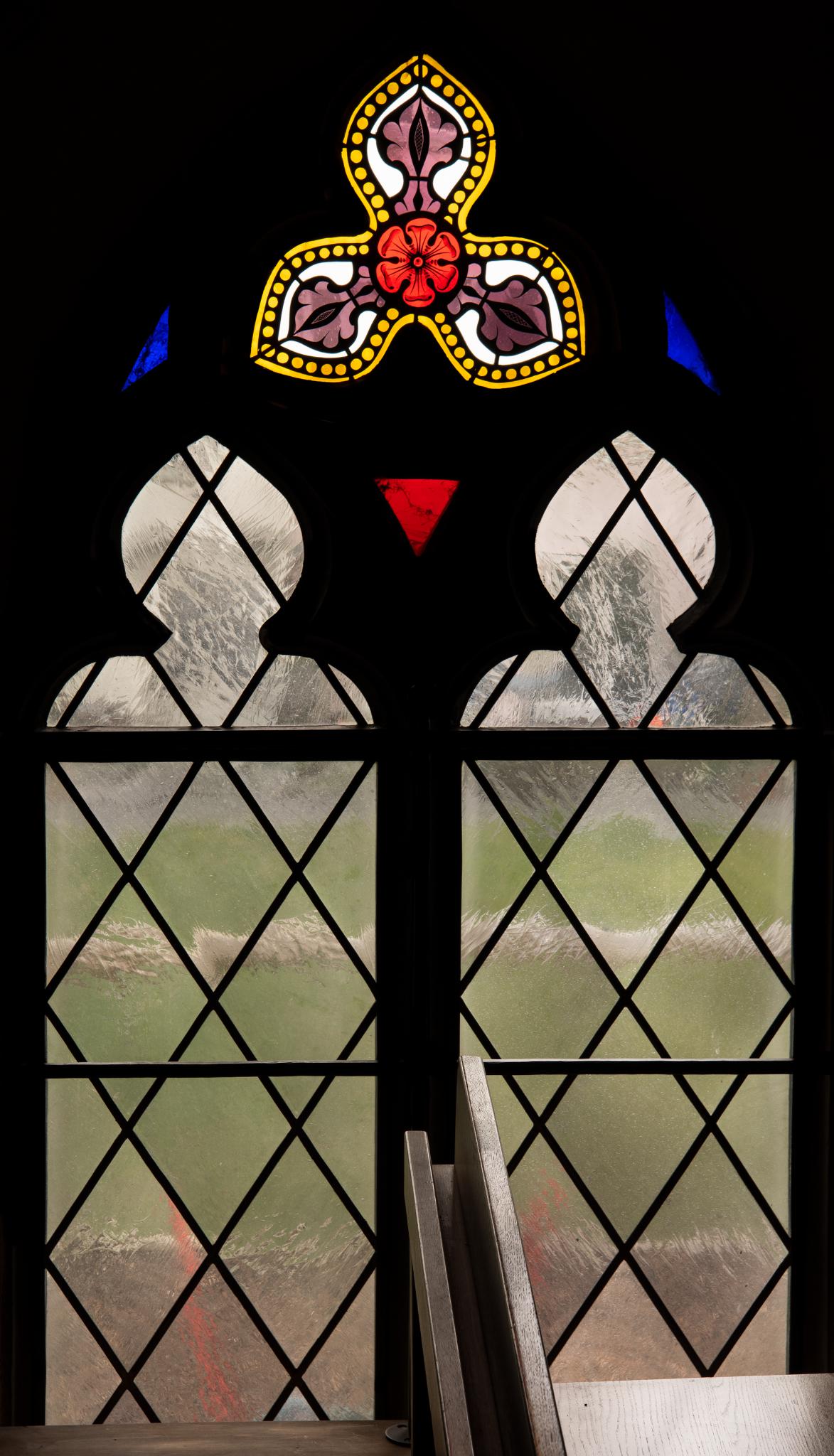 Zweilanzettiges Masswerkfenster mit blanker Rautenverglasung, im farbig gestalteten Couronnement (Dreipass) stilisierte Blätter und Blüte. Identisch mit gegenüberliegendem Fenster s XI.