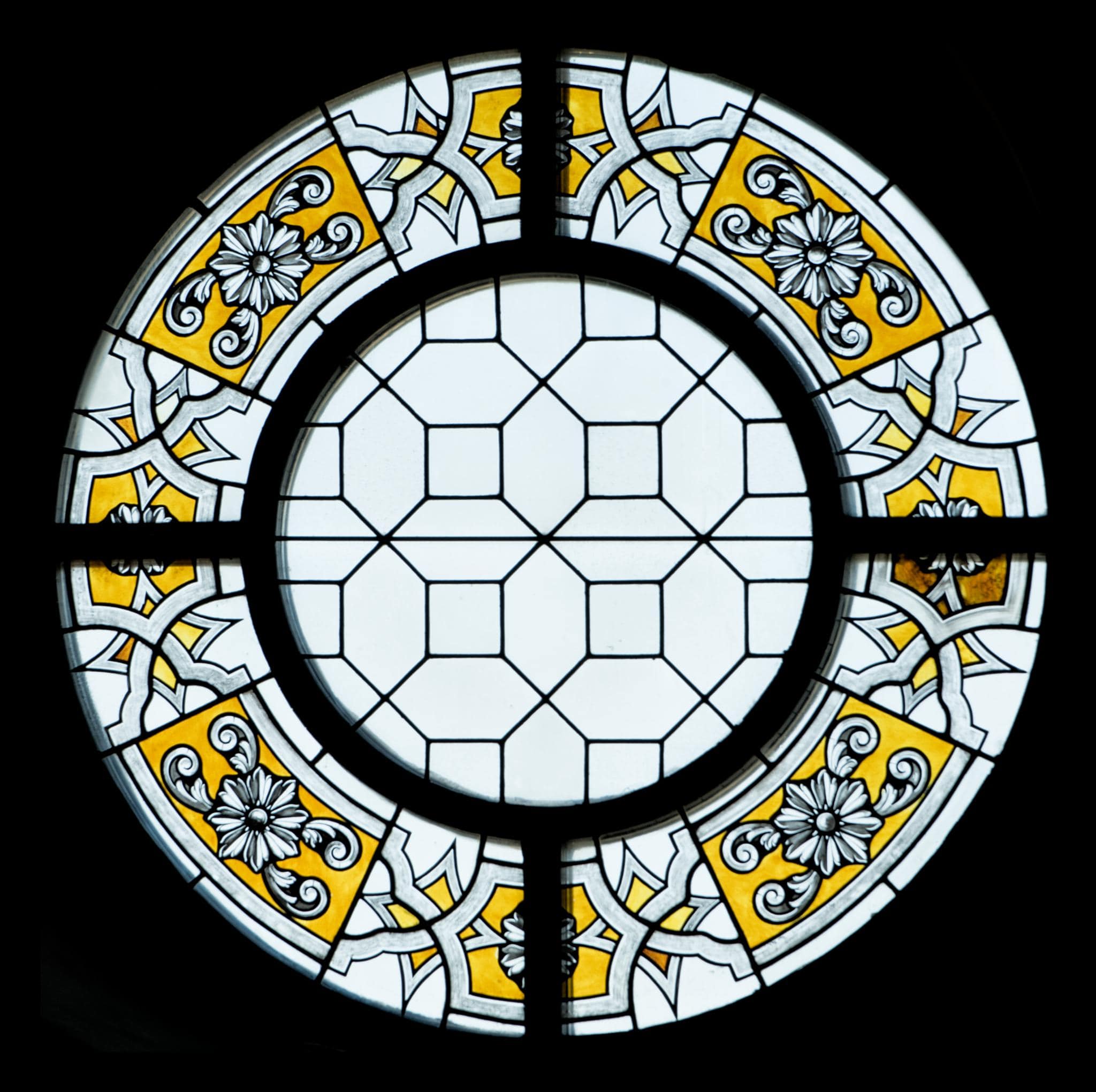 Rundfenster mit breitem, vegetabilem Rahmen in Grisaille und Gelb, ansonsten blank verglast.