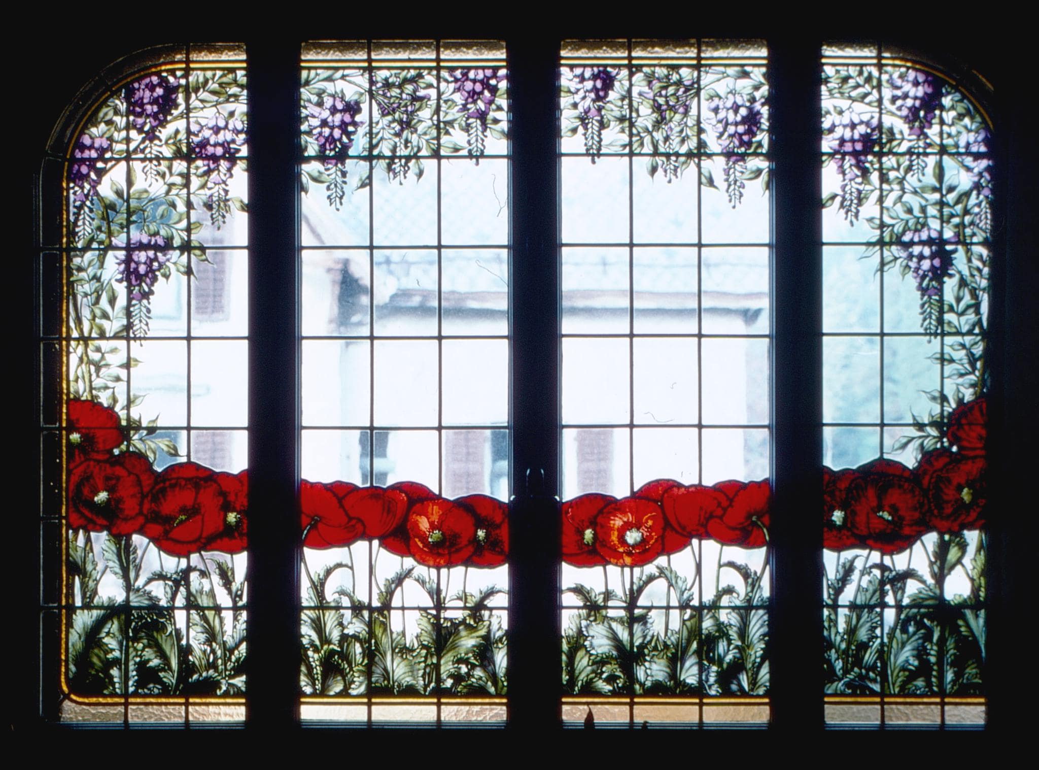 Vierteiliges Korbbogenfenster mit gelber Rahmung und der Darstellung von Mohnblumen im unteren Bereich, sowie von Glyzinien-Ranken im oberen Bereich. Der Mittelteil des Fensters ist blankverglast (Rechteckaufteilung).
