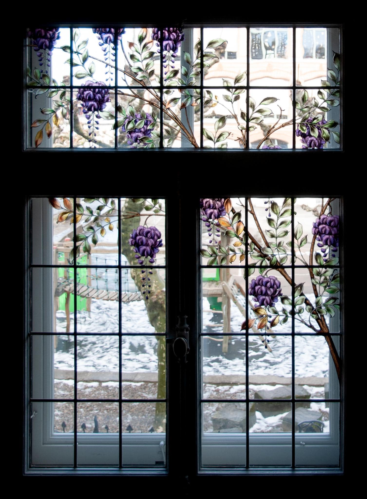 Dreiteiliges rechteckiges Fenster, auf dem ein blühender Blauregenzweig dargestellt ist. Übrige Fensterflächen blankverglast (Rechtecke).