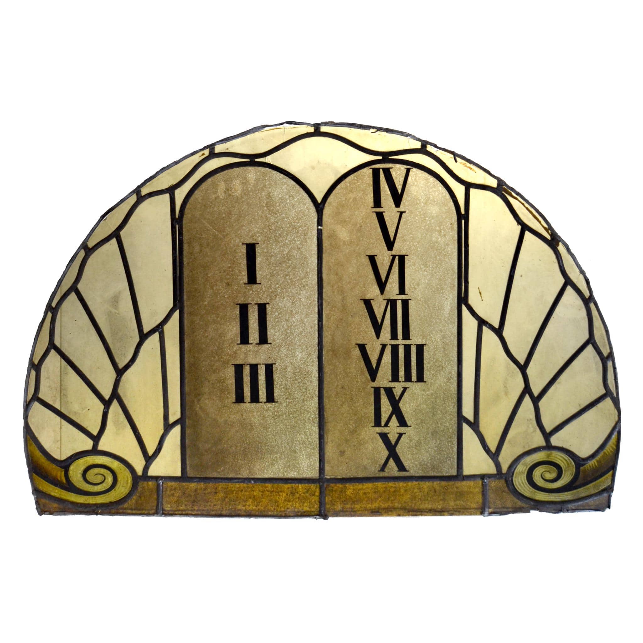 Fragment einer nierenförmigen Fensterverglasung, in deren Zentrum die Gesetzestafeln dargestellt waren. Ein breiter Schmuckrahmen umfasste ursprünglich das ansonsten wohl blank verglaste Fenster. Erhalten ist einzig das Feld mit dem christlichen Symbol.