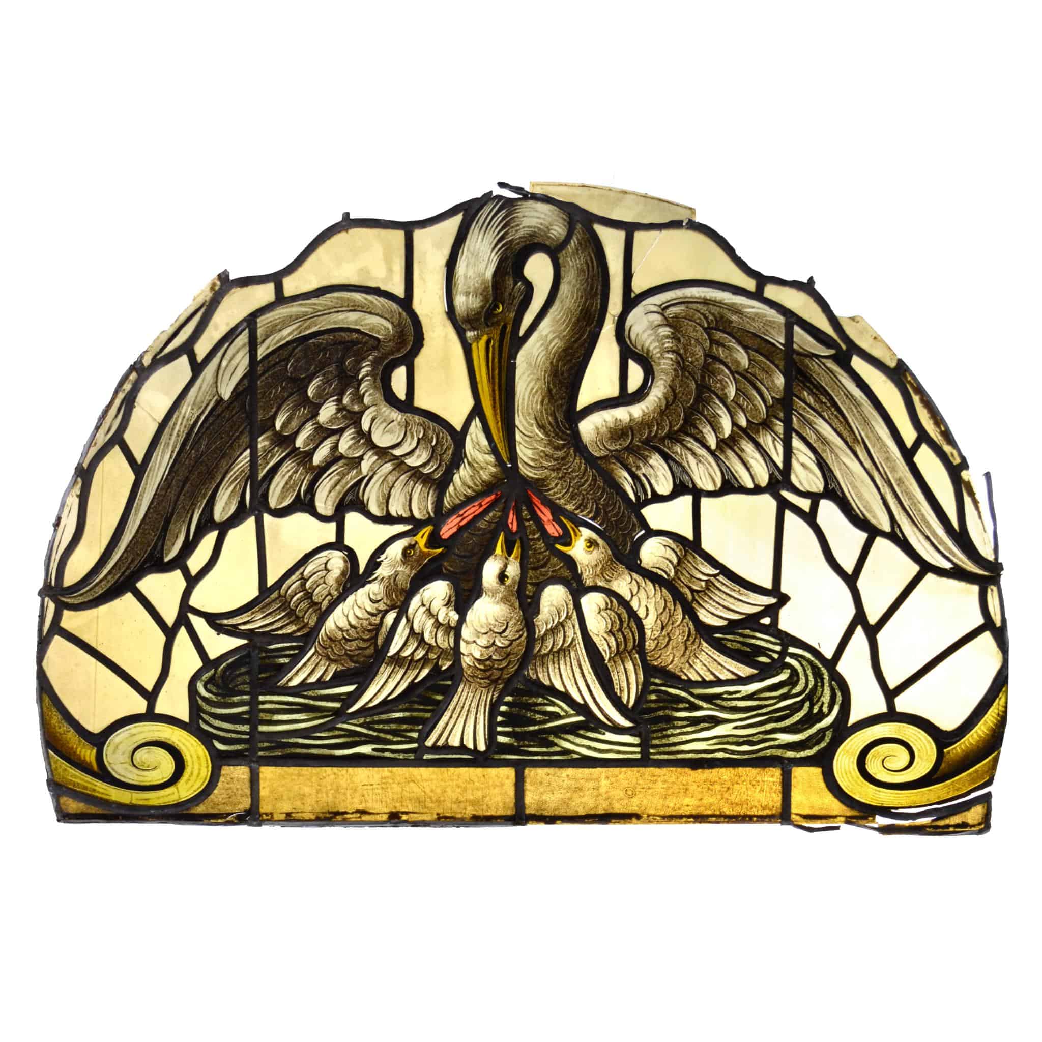 Fragment einer nierenförmigen Fensterverglasung, in deren Zentrum der Pelikan, der seine Jungen mit dem eigenen Blut füttert, dargestellt war. Ein breiter Schmuckrahmen umfasste ursprünglich das ansonsten wohl blank verglaste Fenster. Erhalten ist einzig das Feld mit dem christlichen Symbol.