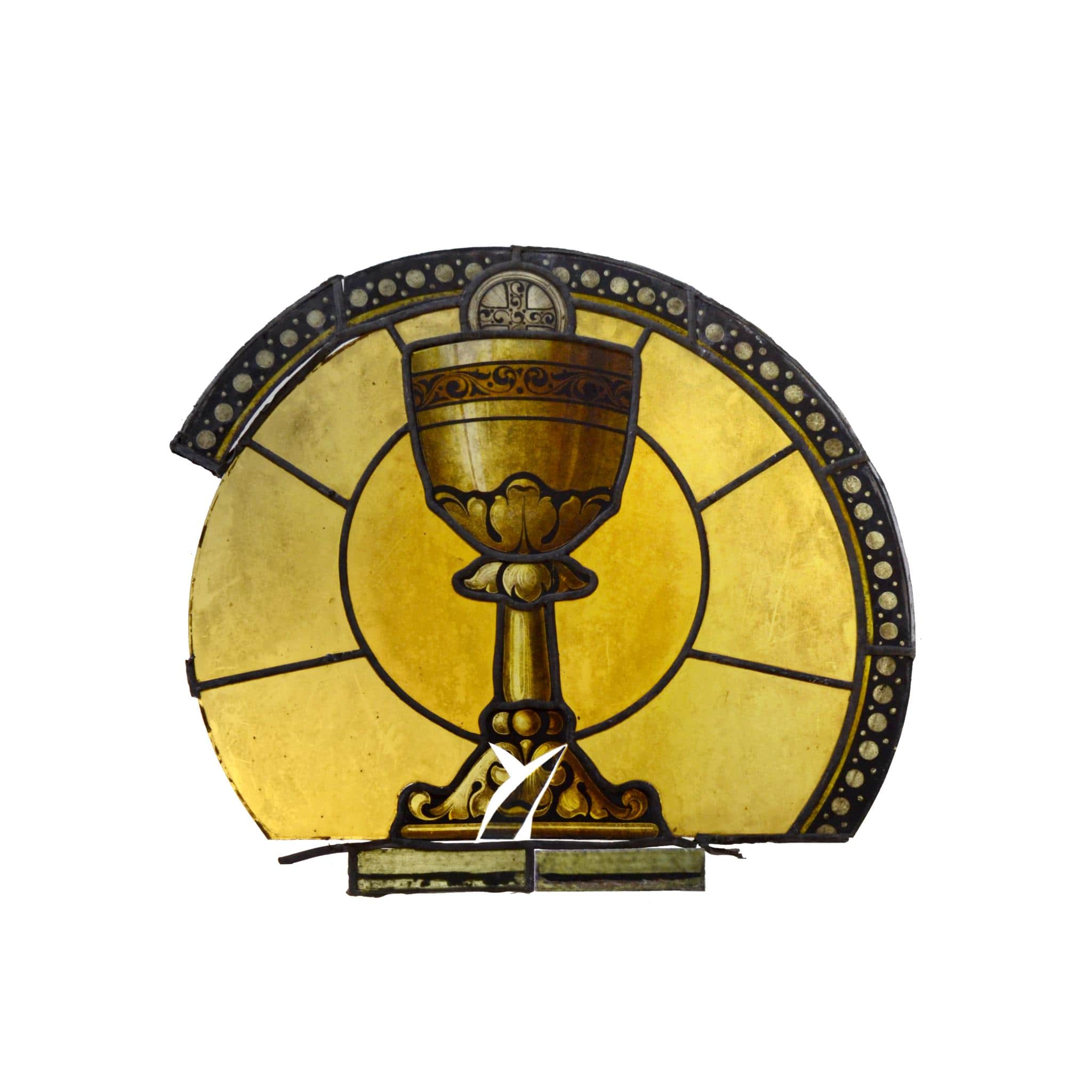 Fragment einer nierenförmigen Fensterverglasung, in deren Zentrum ein Kelch mit einer Hostie dargestellt war. Ein breiter Schmuckrahmen umfasste ursprünglich das ansonsten wohl blank verglaste Fenster. Erhalten ist einzig das christliche Symbol.