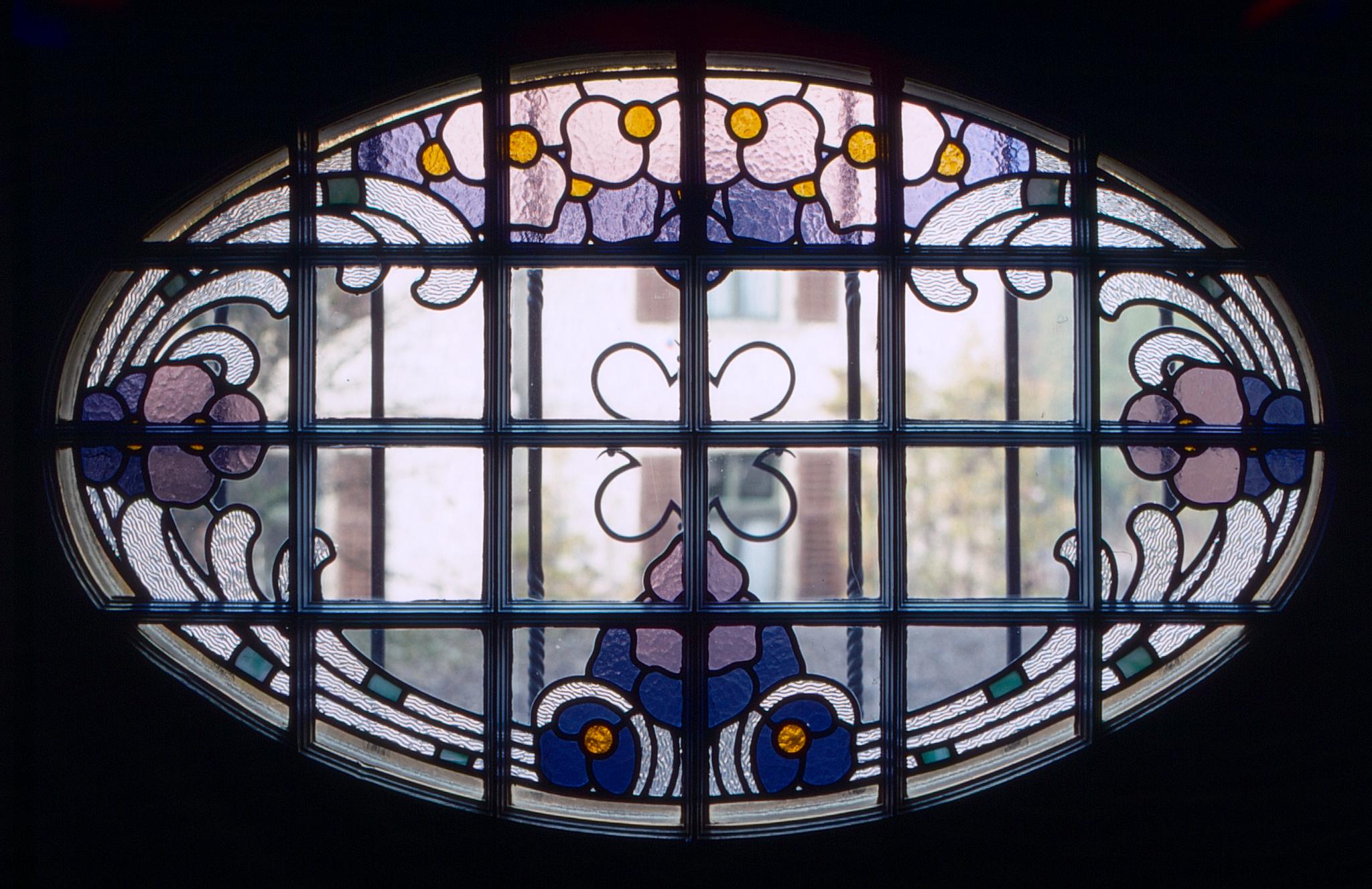 Quergelagertes Ovalfenster mit stilisierten Blumen- und Wellendarstellungen in Violett und Gelb.