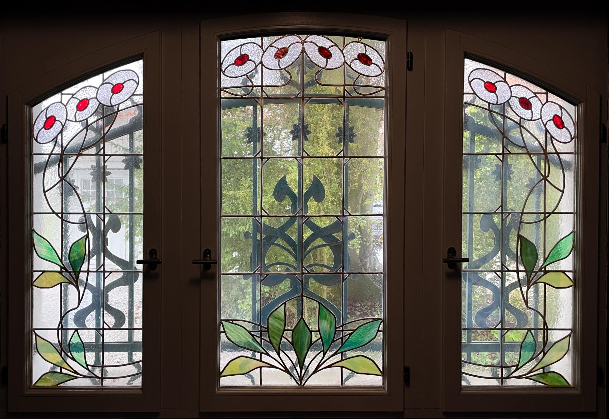 Dreiteiliges Segmentbogenfenster mit stilisierten weissen Blumen im Jugendstil.