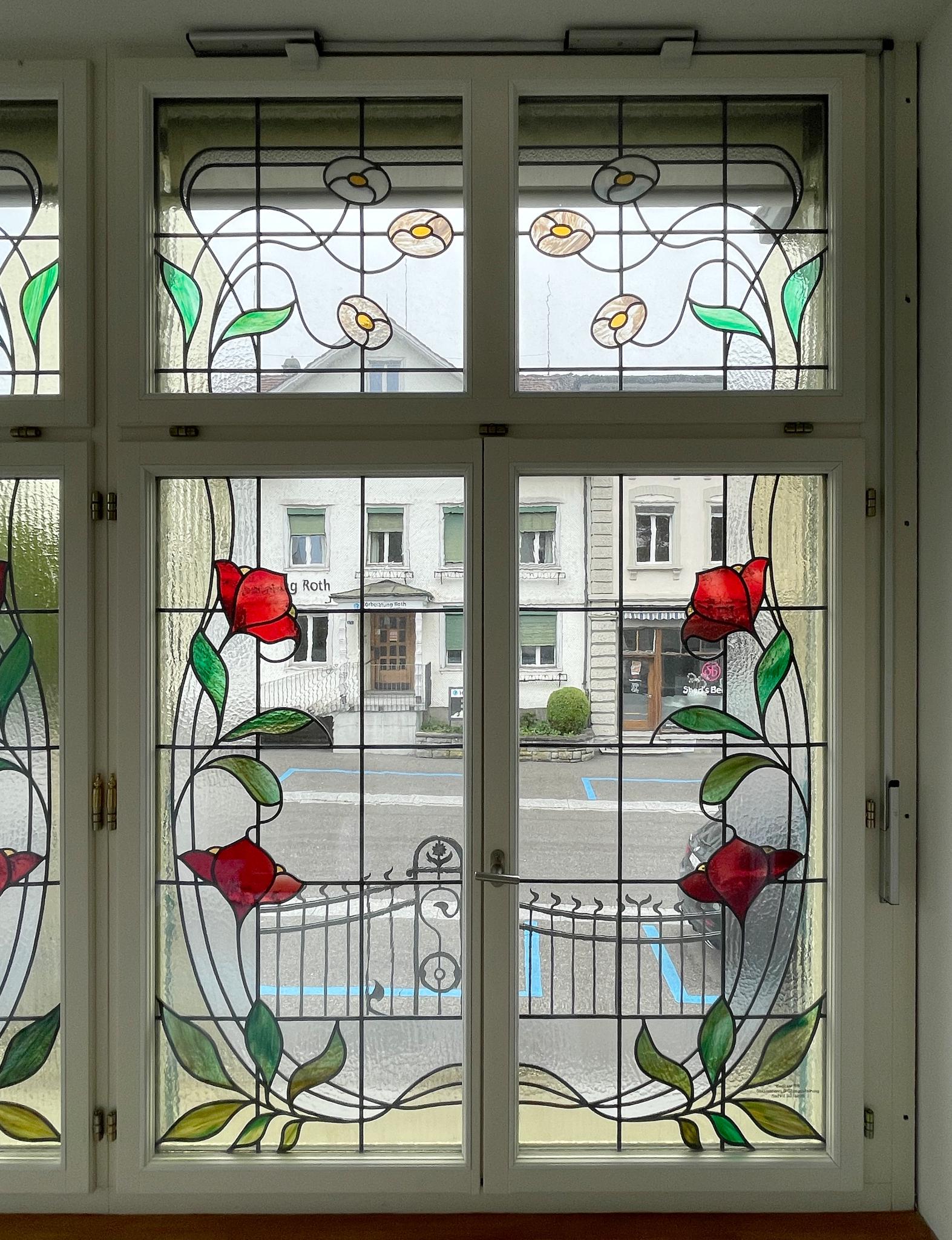 Vierteiliges rechteckiges Fenster mit stilisierten roten und weissen Blumen im Jugendstil. Teil einer Verandaverglasung aus insgesamt vier Fenstern.