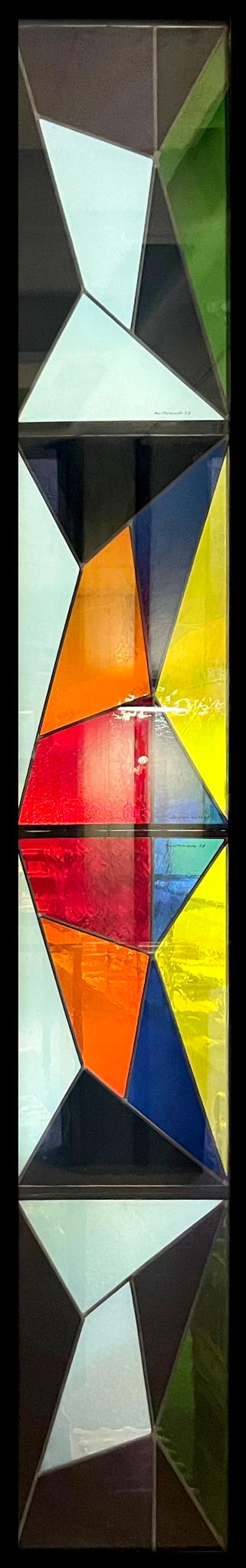 Hochrechteckiges geometrisches Glasgemälde, gebildet aus farbigen Polygonen. Die Mitte der symmetrisch aufgebauten Glasmalerei ist in Rot, Orange, Gelb und Blau gehalten, zum oberen und unteren Rand hin folgen schwarze, weisse und grüne Polygone.