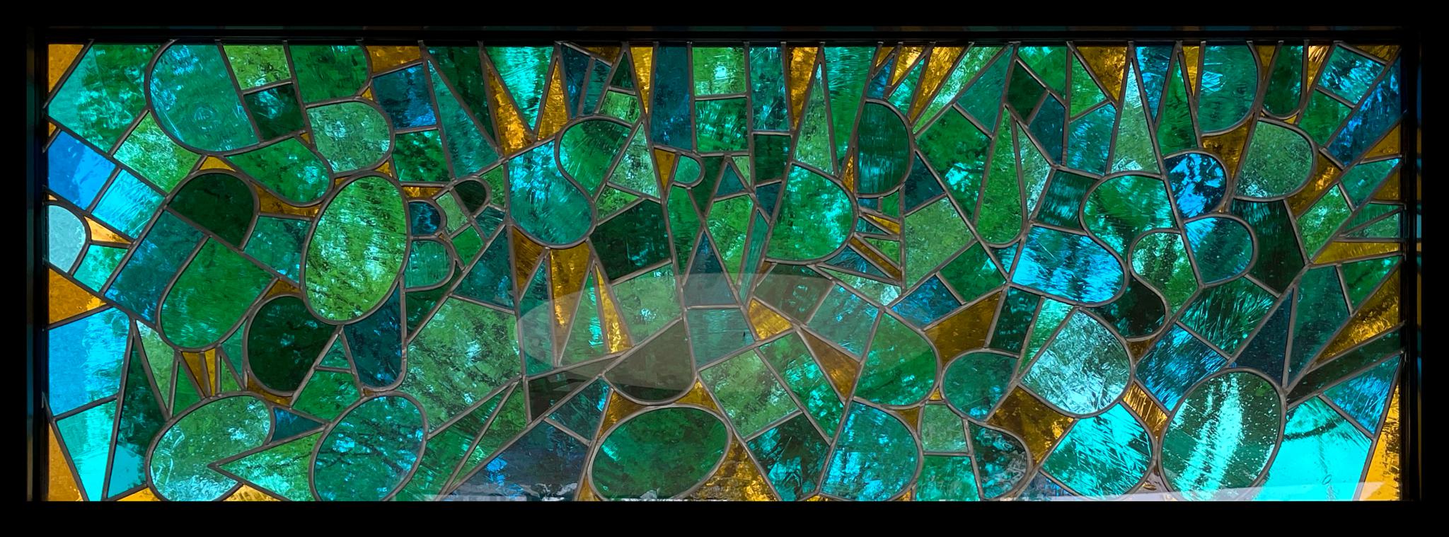 Rechteckiges Glasgemälde mit Ornament aus Buchstaben. Grundfarbe Türkis.