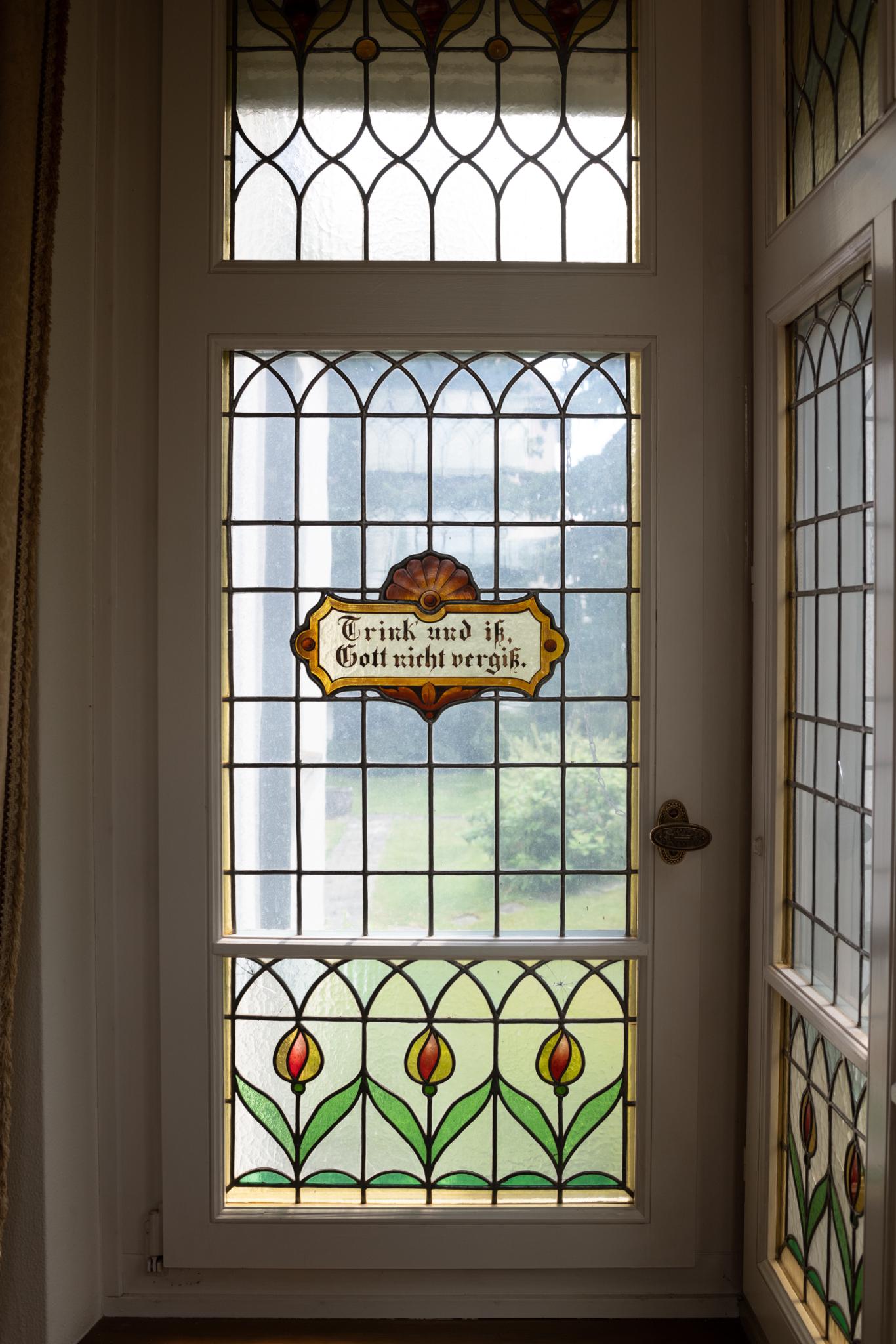 Seitliche Verglasung eines Erkers. Hochrechteckiges Fenster mit Blankverglasung in Rechtecken und einem Medaillon mit Trinkspruch im Zentrum. Am unteren Fensterrand Bordüre mit stilisierten Tulpen, am oberen Rand Bordüre mit Blütenornament.