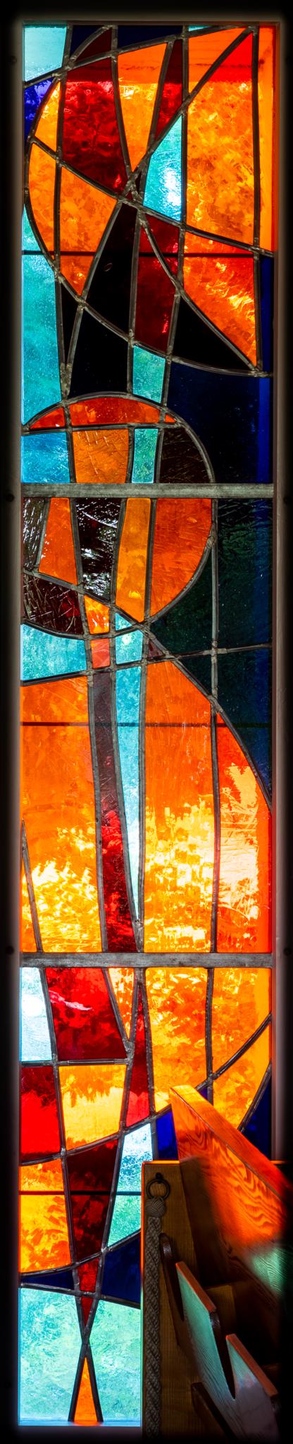 Hochrechteckfenster mit abstrakt-geometrischer Glasmalerei. Dominierende Orangetöne.